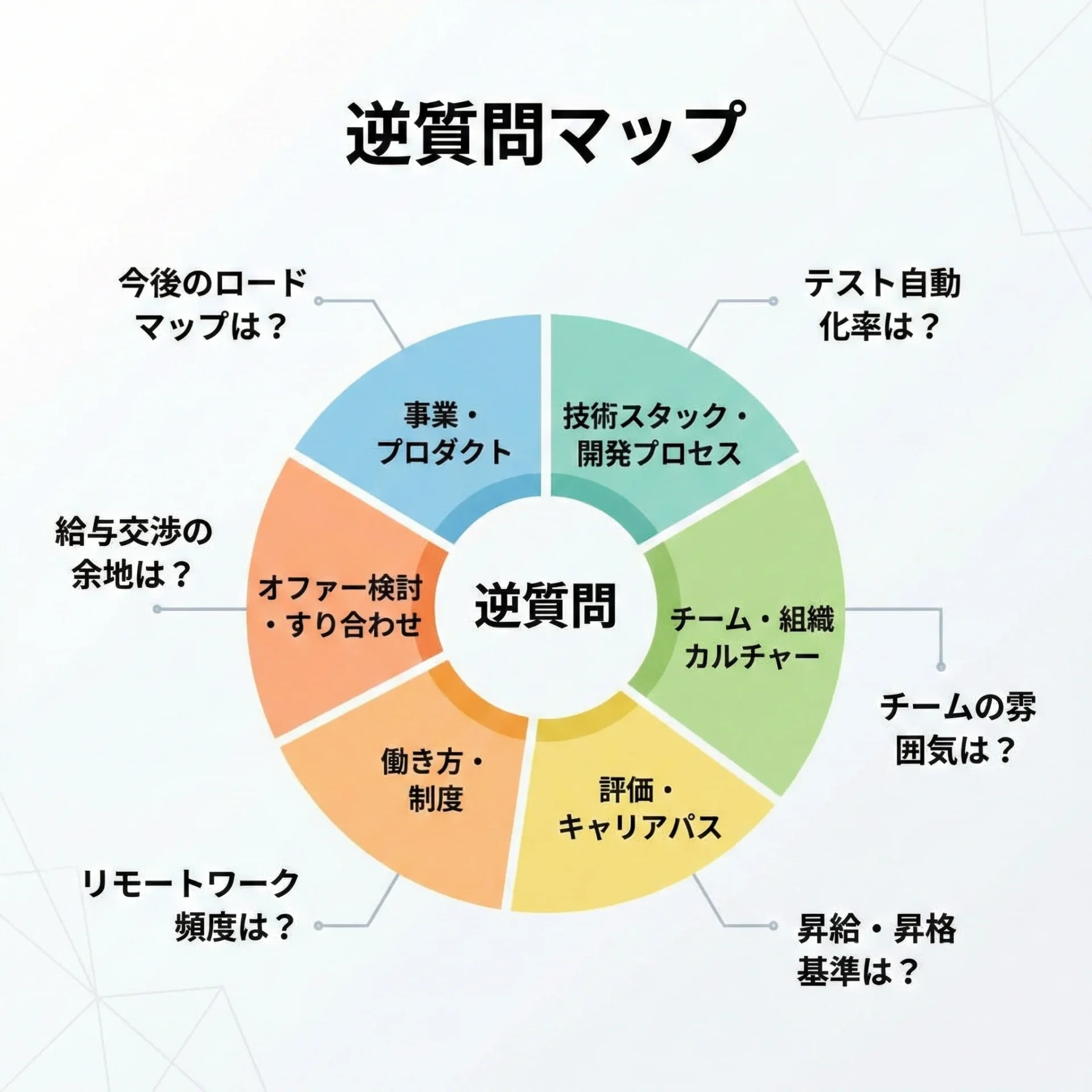 本記事では、エンジニア面接における逆質問を「評価が上がる質問」と「自分を守るための質問」という2つの観点から整理しています。
