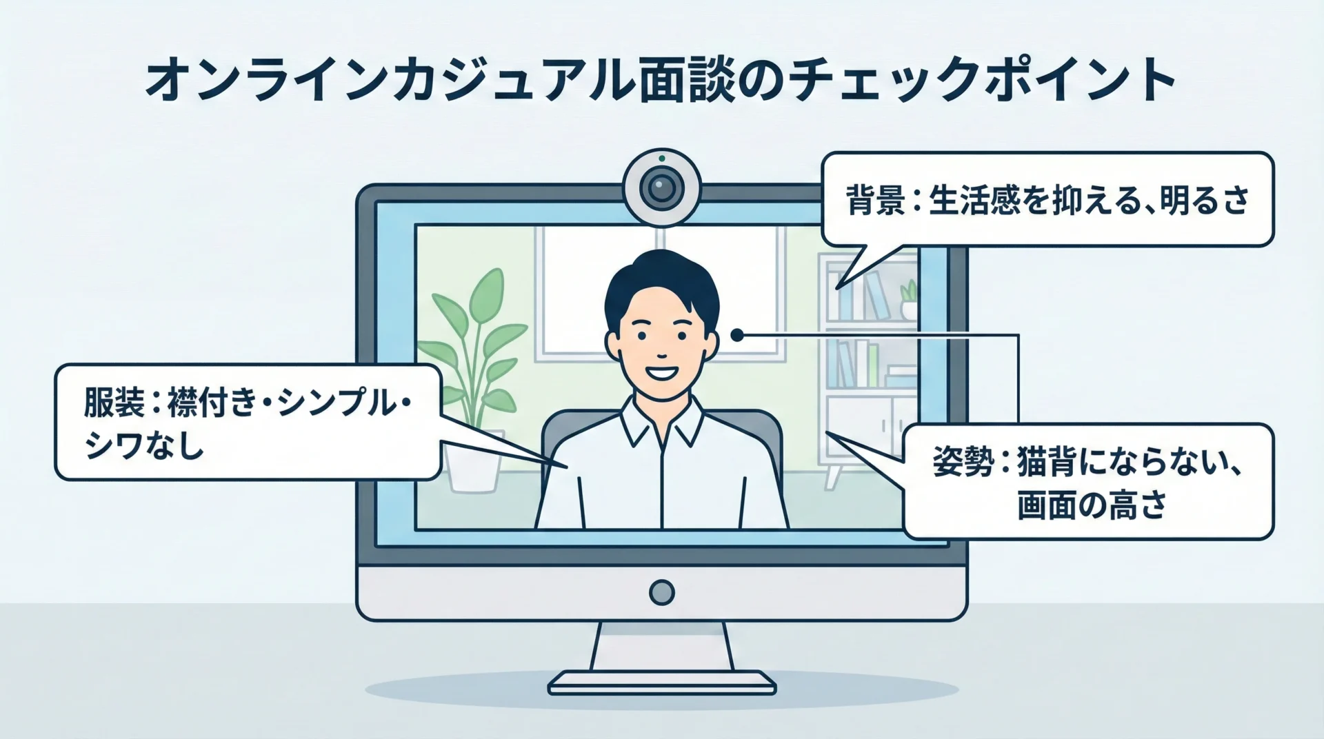 オンラインの場合、全身が映らないことから油断しがちですが、上半身は対面と同程度のビジネスカジュアルを意識するのが基本です。