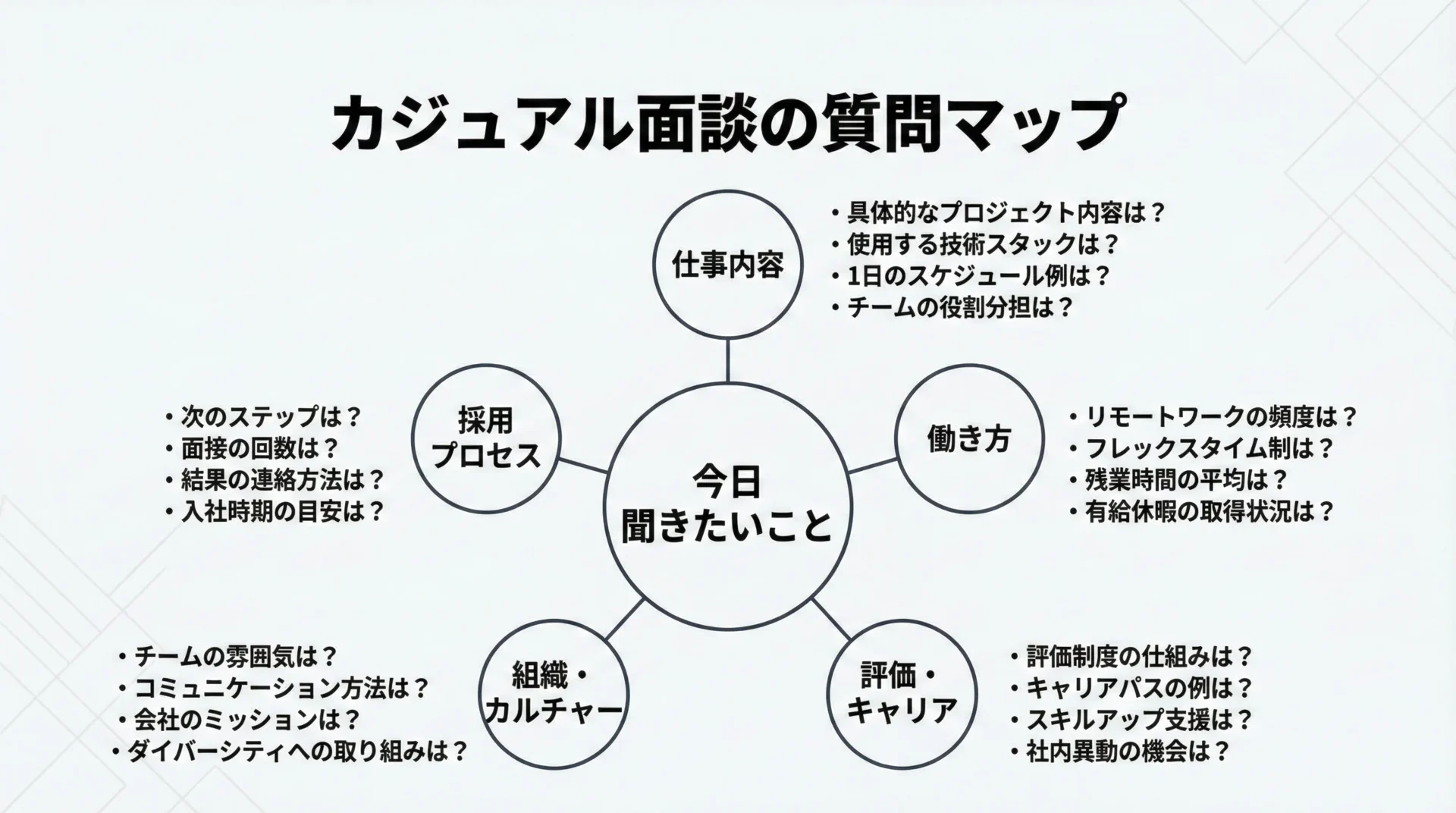 ここからは、具体的な質問例をテーマ別に紹介します。