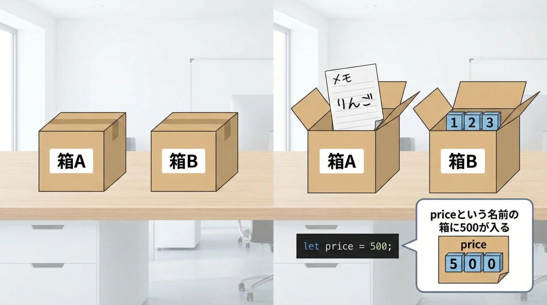このような図解を用いると、変数や配列、オブジェクトといった概念を空中戦ではなく「目に見えるもの」として捉えられるため、抽象思考に苦手意識がある文系の方でも理解しやすくなります。
