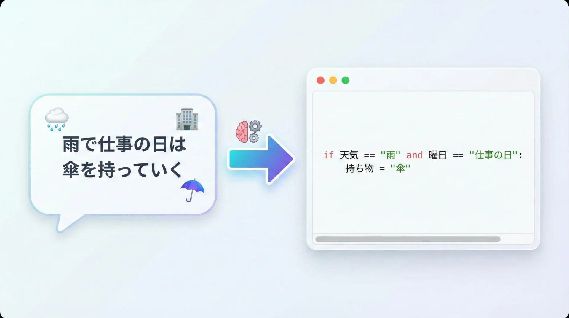 - 例: 「もし雨が降っていて、かつ仕事の日なら、傘を持って出かける」