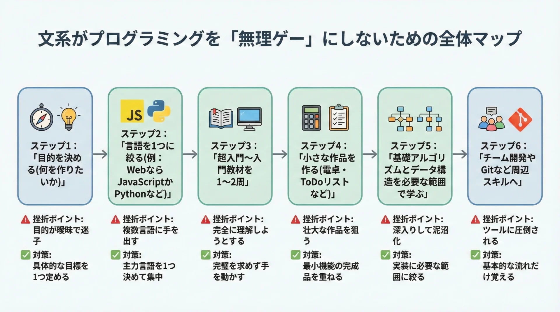 このように、文系の方がプログラミングを学ぶ際には、「何のために学ぶのか」を明確にし、使う言語や教材をシンプルに絞り込むことが重要です。