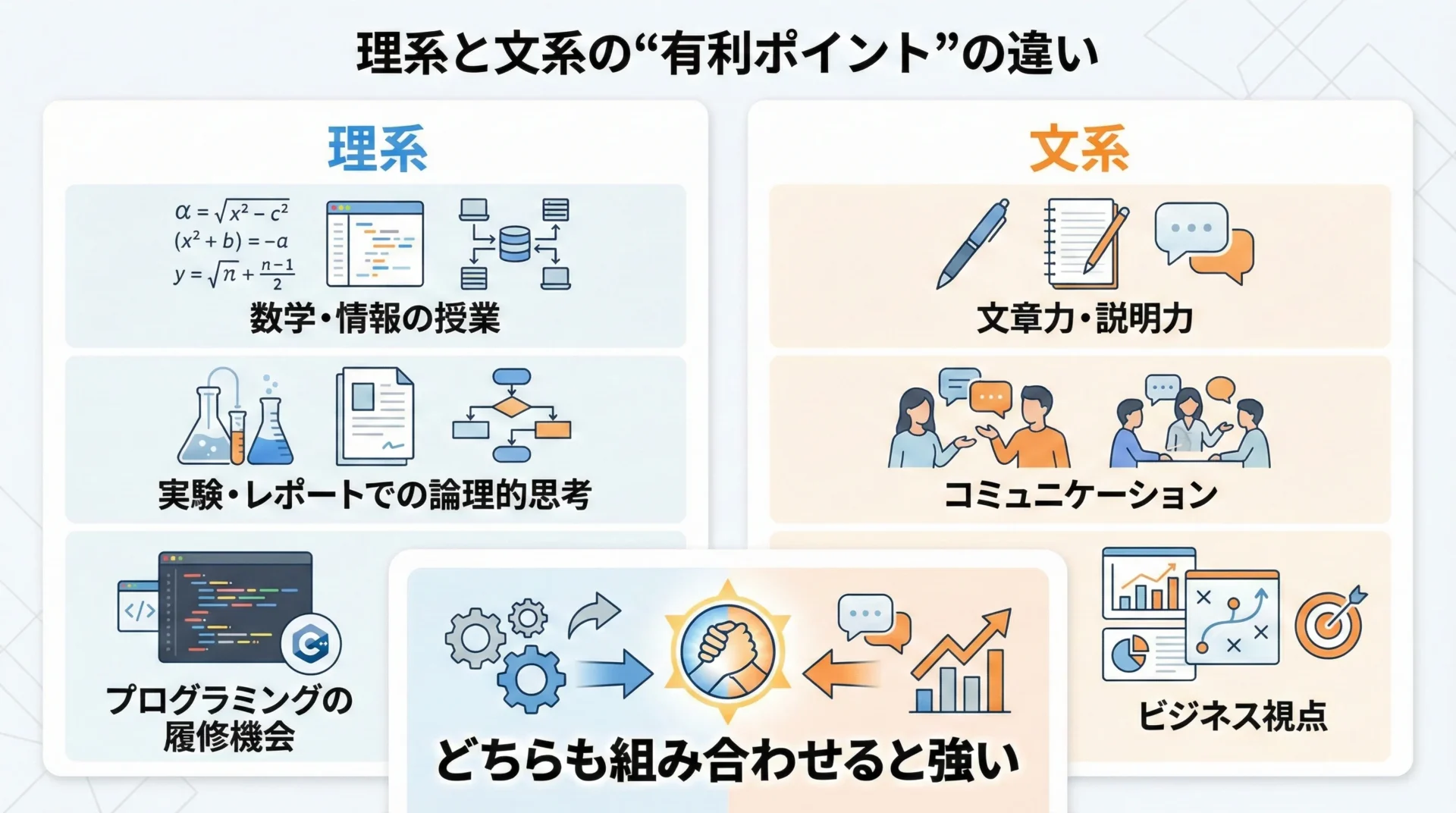 そのため、理系という属性は「少し有利なスタートダッシュ要素」程度と考えるのが現実的です。