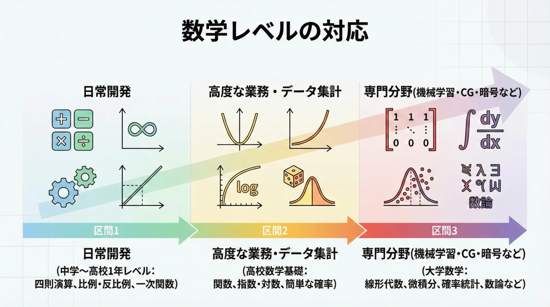 フロントエンド、バックエンド、業務アプリ、ゲーム、AI、データ分析など、それぞれで求められる数学のレベルも変わります。