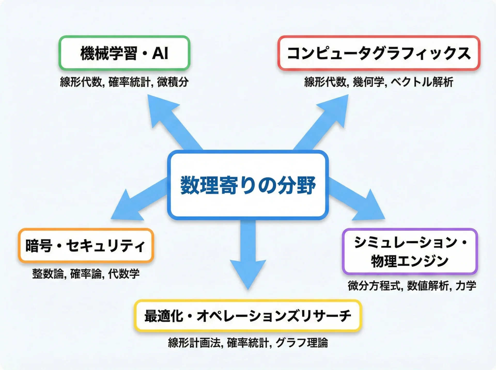 - 分野によっては数値解析や離散数学(グラフ理論、論理学)