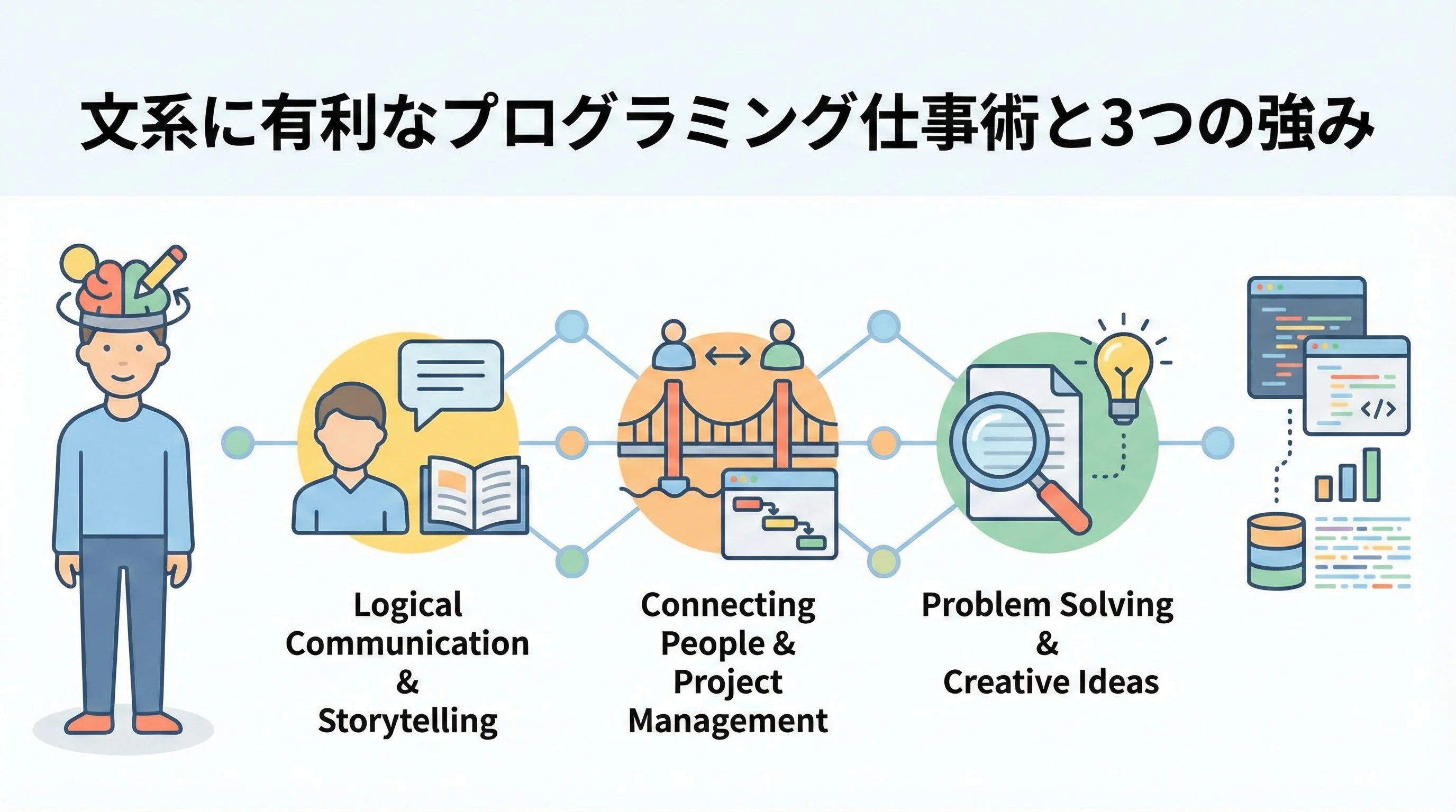 ここからは、文系がプログラミングの現場で特に生かしやすい3つの代表的な強みを取り上げ、それぞれがどのようなシーンで役に立つのかを解説します。