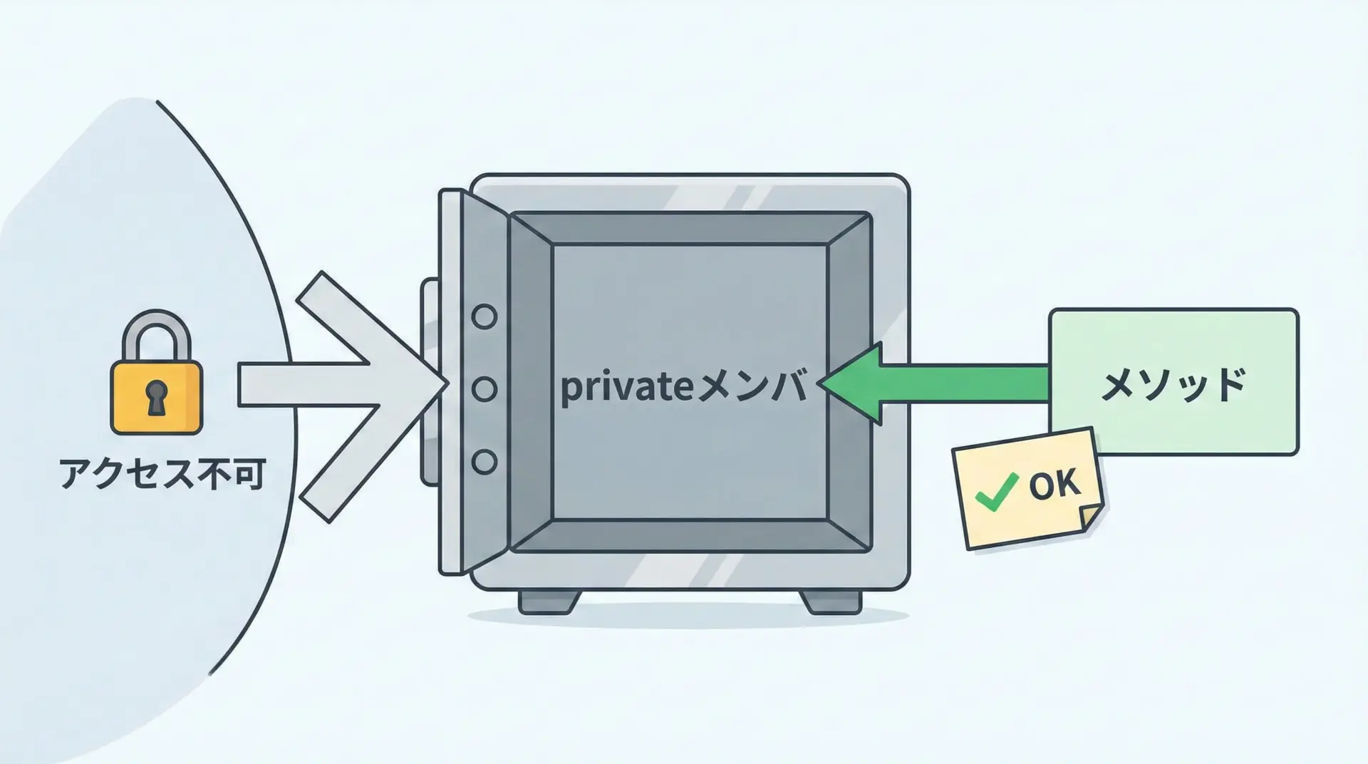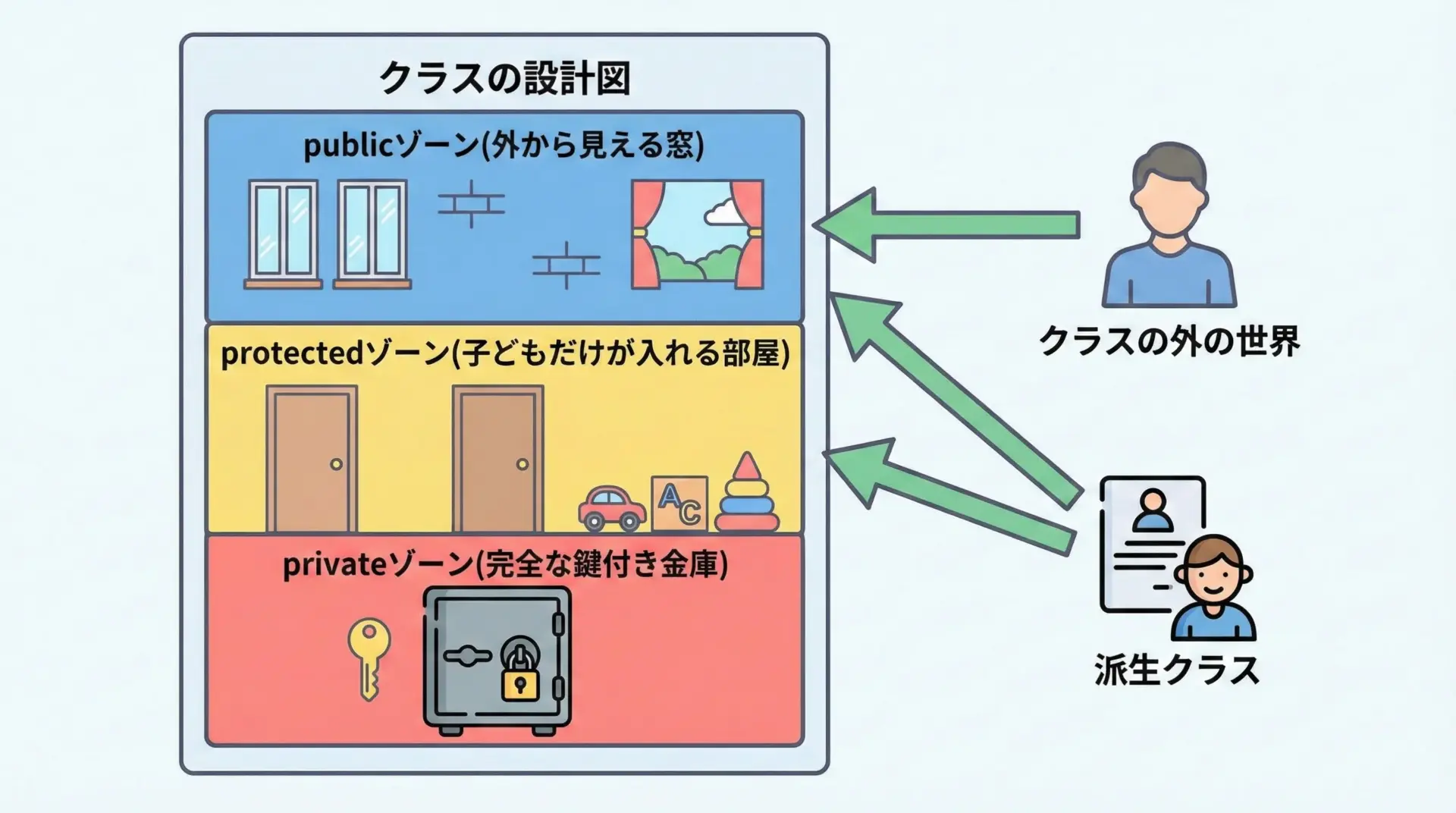 本記事では、初心者の方でもイメージしやすいように、図解と具体的なコード例を用いながら、3つのアクセス修飾子の違いと使い分けを丁寧に説明していきます。