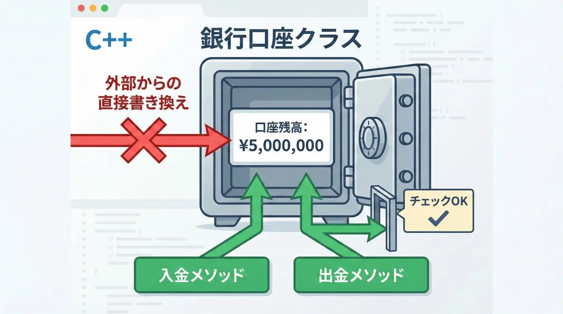 例えば、銀行口座の残高を表す変数があったとして、外部から自由に変更できてしまうと、勝手に残高を増やす、といった不正な操作も技術的には可能になってしまいます。