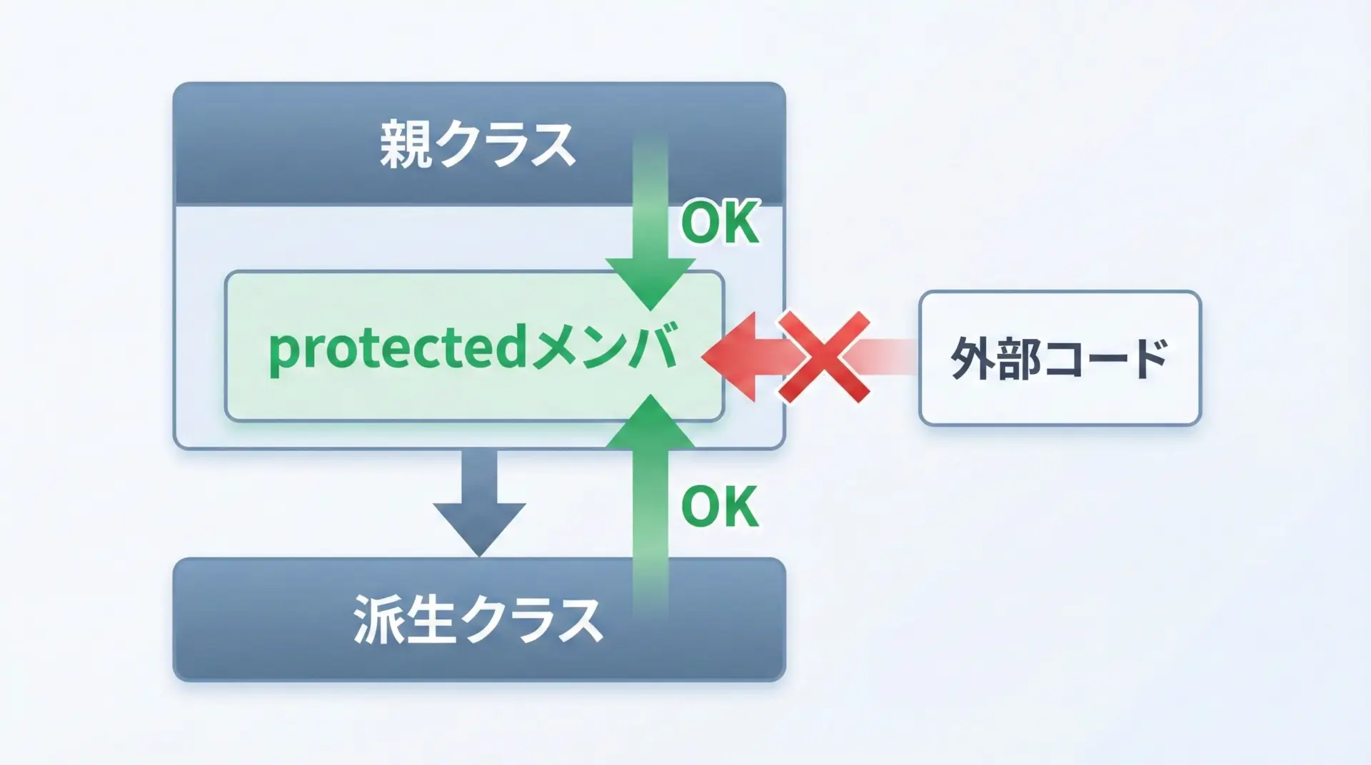 protectedは「クラス自身」と「その派生クラス」からはアクセスできるが、それ以外からはアクセスできないメンバを宣言します。