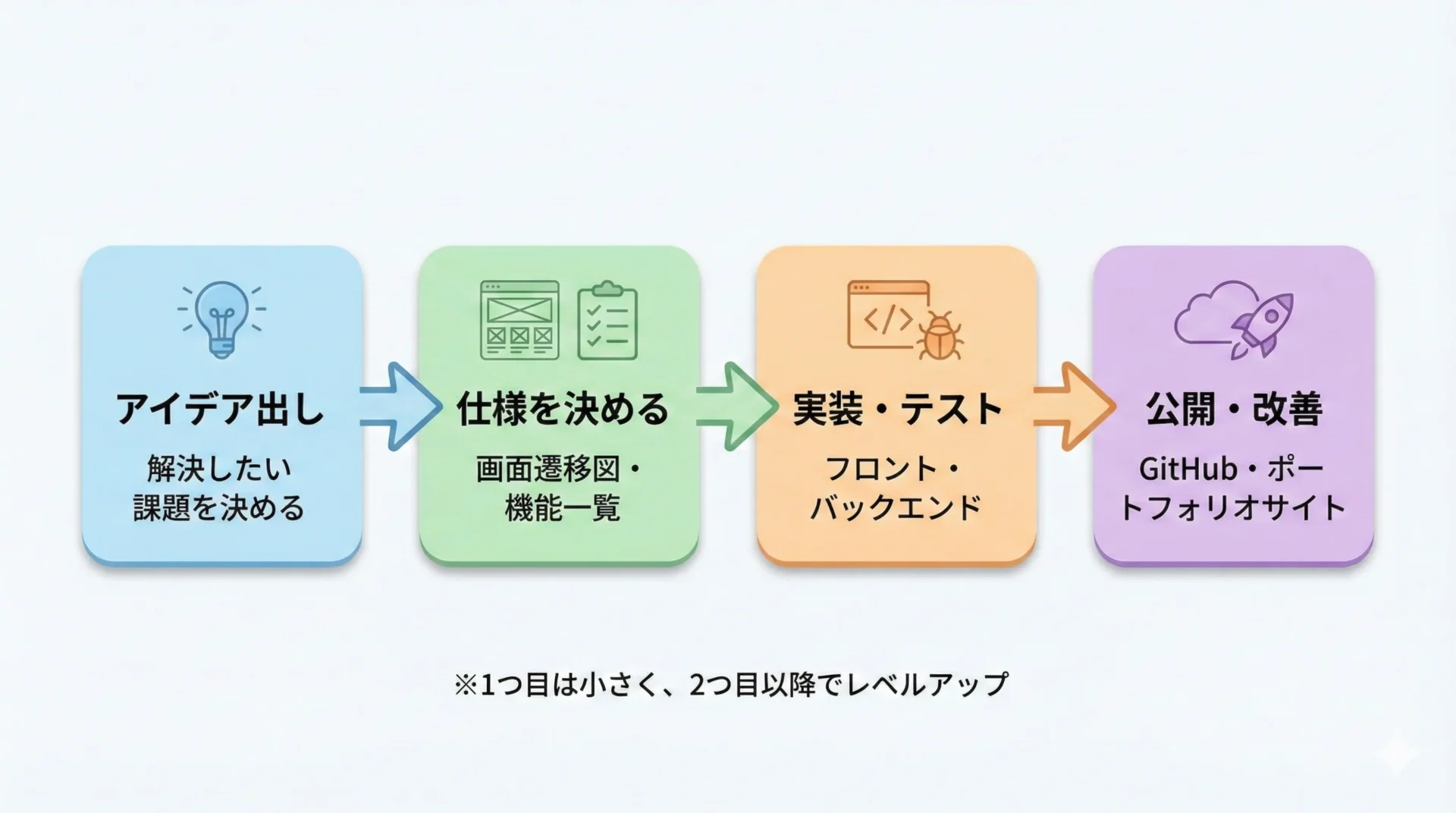 基礎を一通り学んだら、実際にサービスを作り込み、ポートフォリオとして形にする段階です。