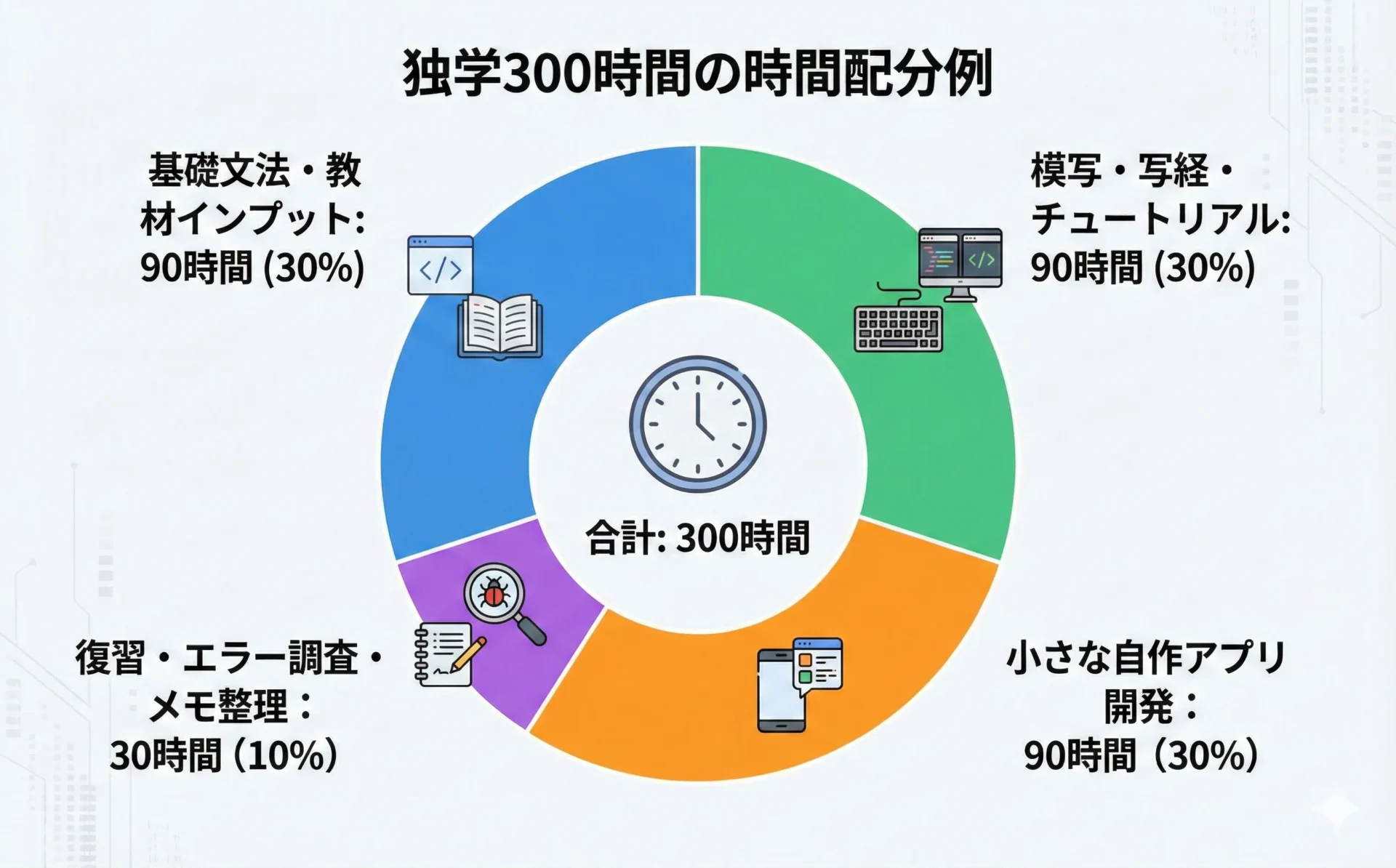 ここでは、独学者向けに、入門〜初級レベル(約300時間)までの時間配分の一例を紹介します。