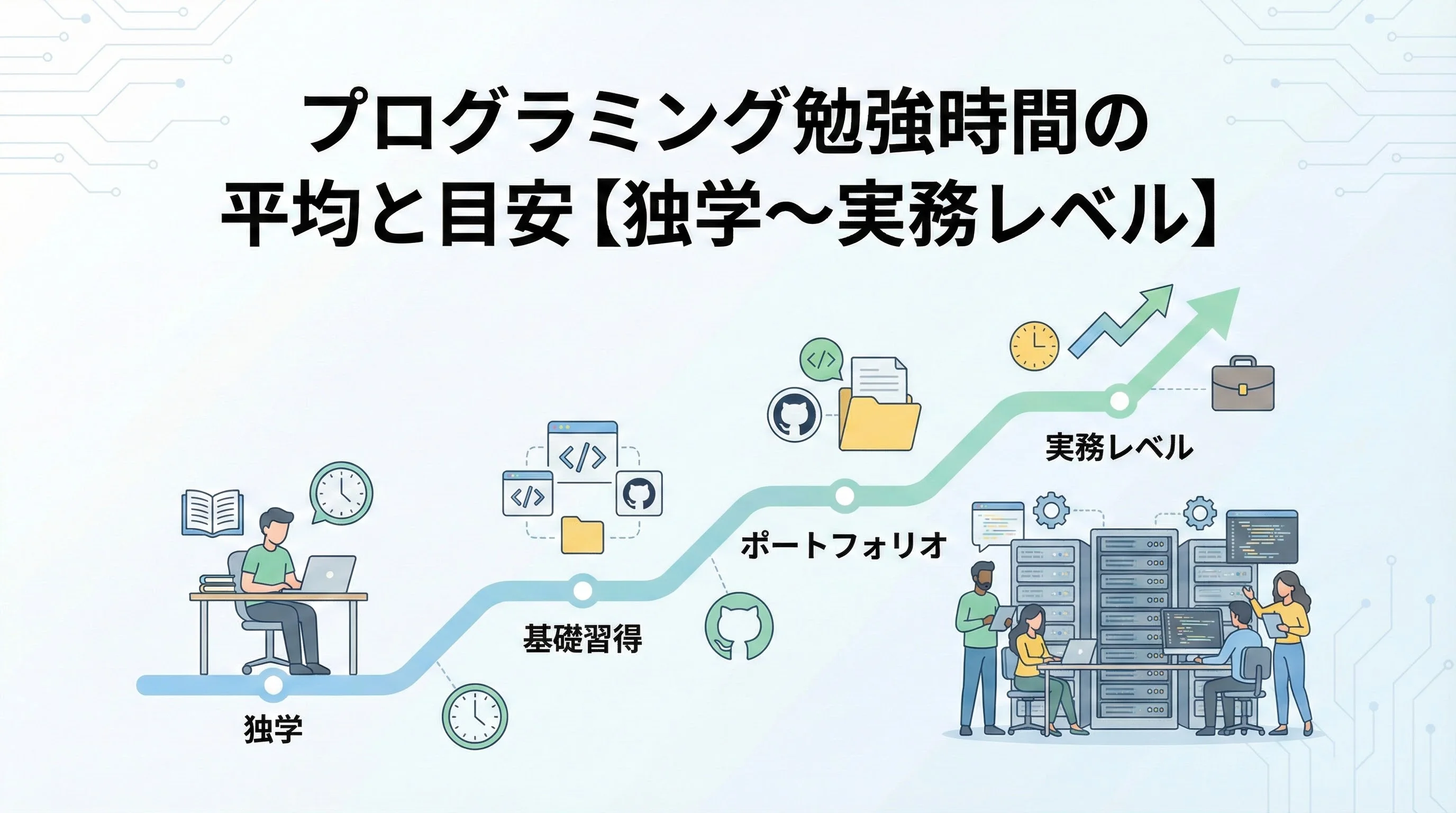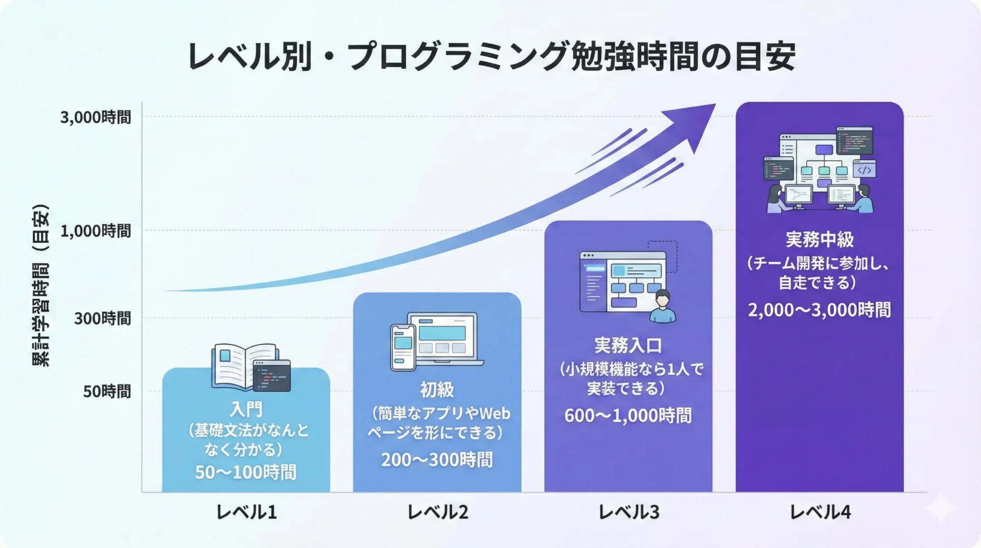プログラミングの勉強時間は、入門レベルで50〜100時間、初級レベルで200〜300時間、実務入口で600〜1,000時間、中級レベルで2,000〜3,000時間が一つの目安になります。