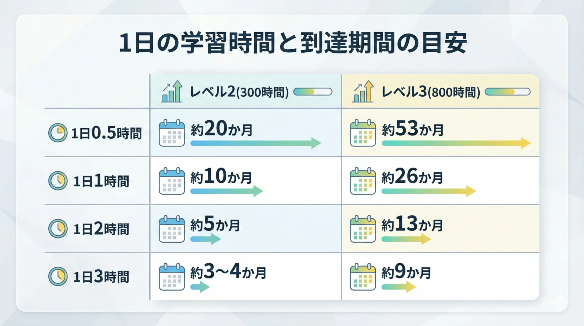 ここでは、よくある1日の学習時間別に、レベル2・レベル3までの到達目安を整理します。