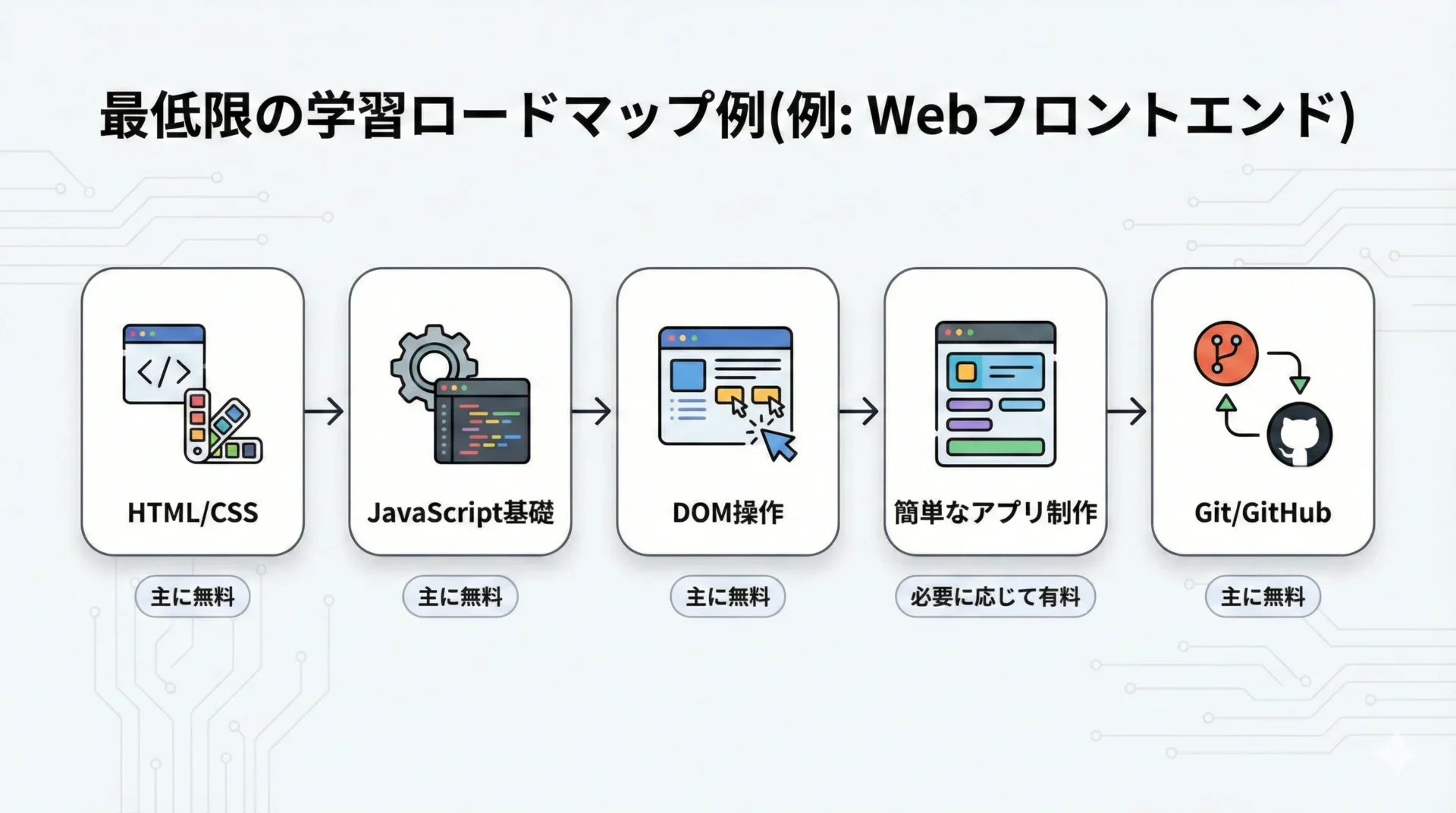 この流れを意識することで、有料教材は「補助輪」として最低限にとどめつつ、無料リソースを主軸に学習を進めることができます。