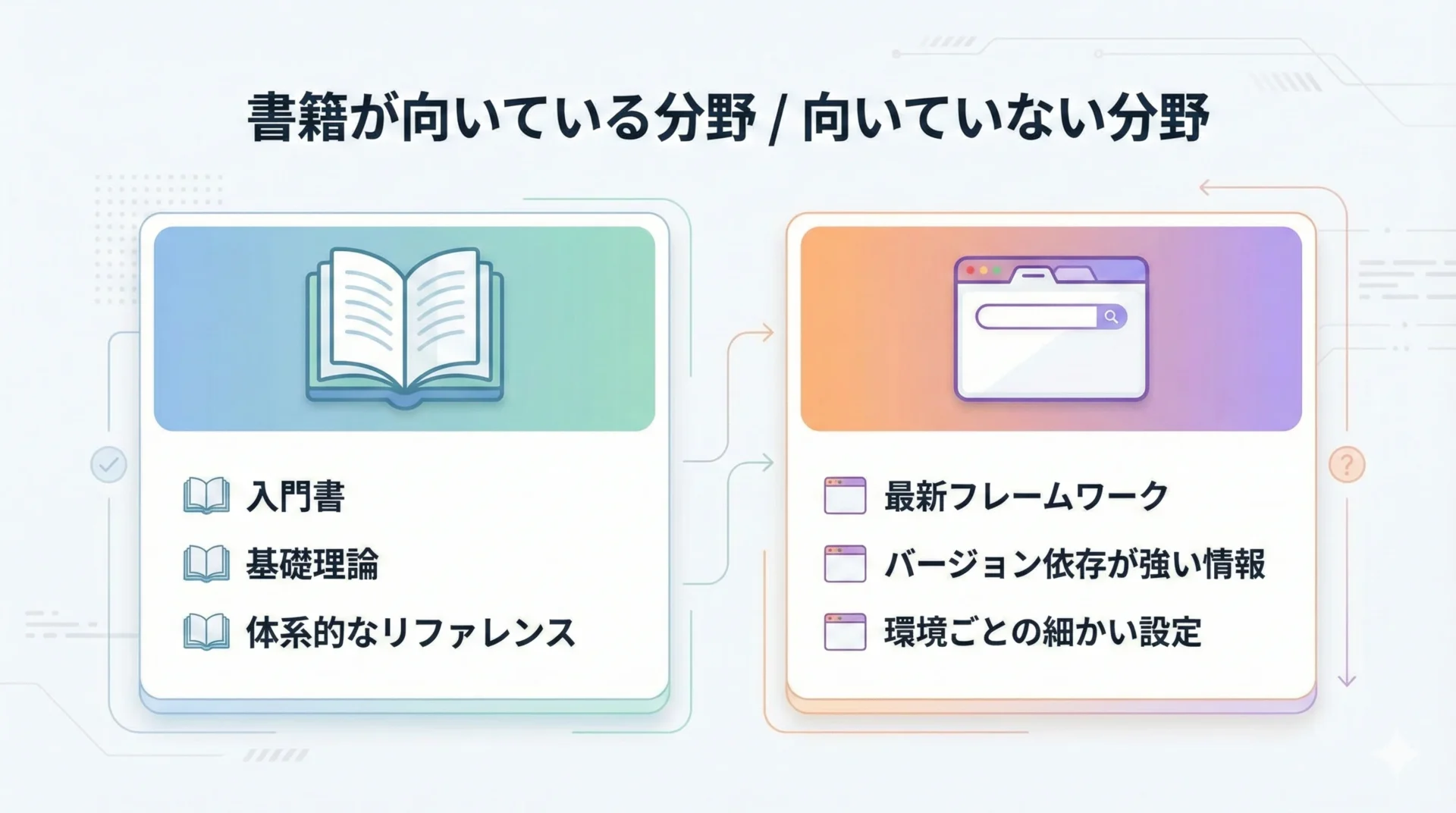 一方で、最新フレームワークの細かい機能解説や、バージョン依存の強い情報は、ウェブ記事や公式ドキュメントの方が更新も早く、無料で高品質な情報を得やすい分野です。