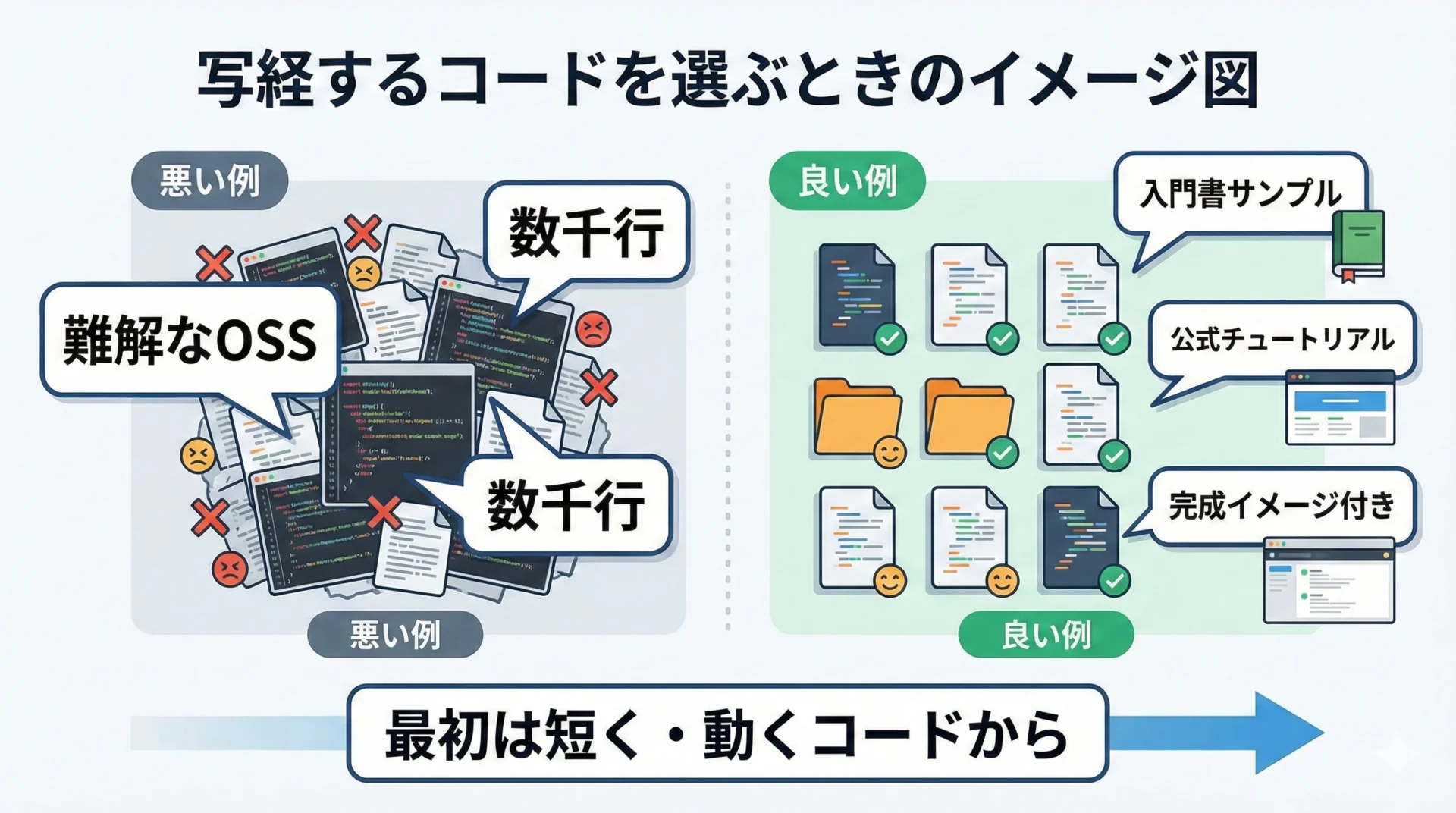 いきなり難しいオープンソースを写すのではなく、次のような基準を意識してください。