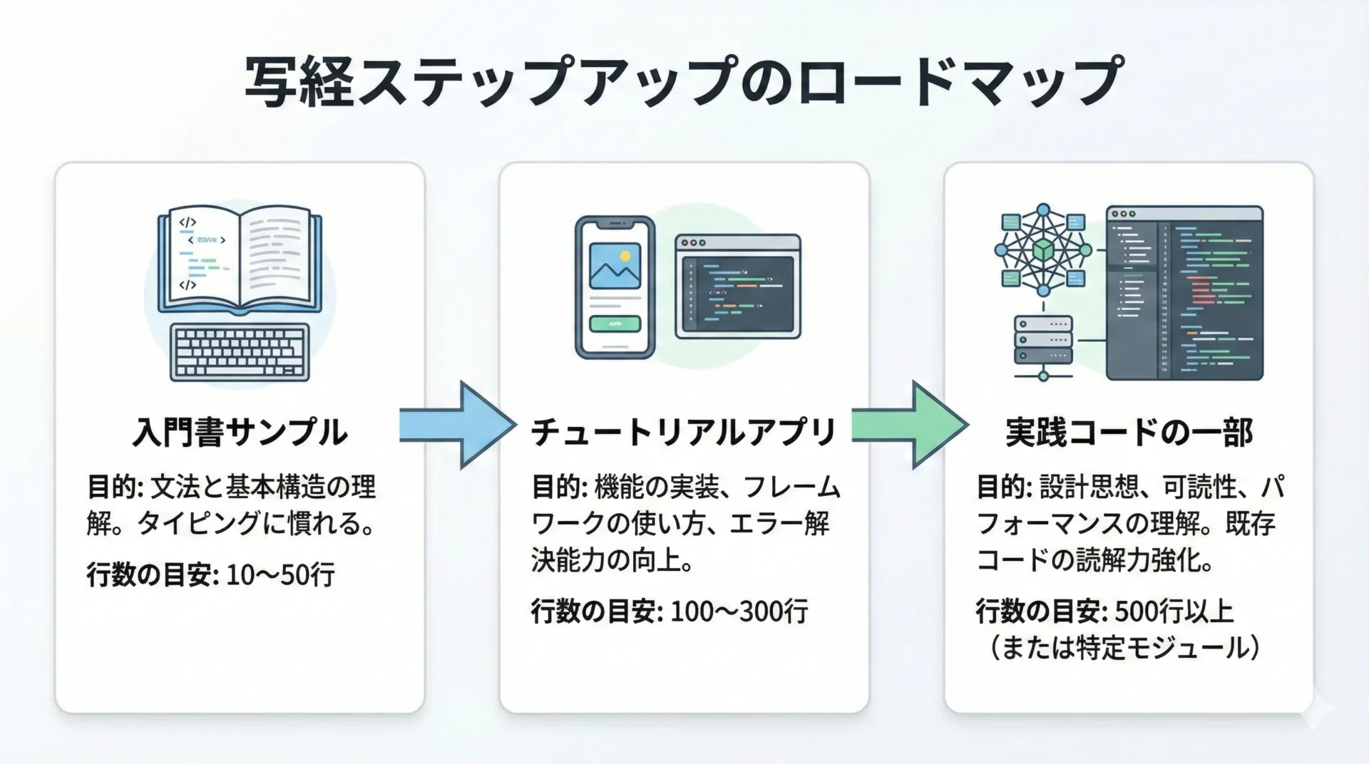 逆に、すでに中級以上で、フレームワークや設計の試行錯誤をしている段階では、写経だけでは伸び悩むことがあります。