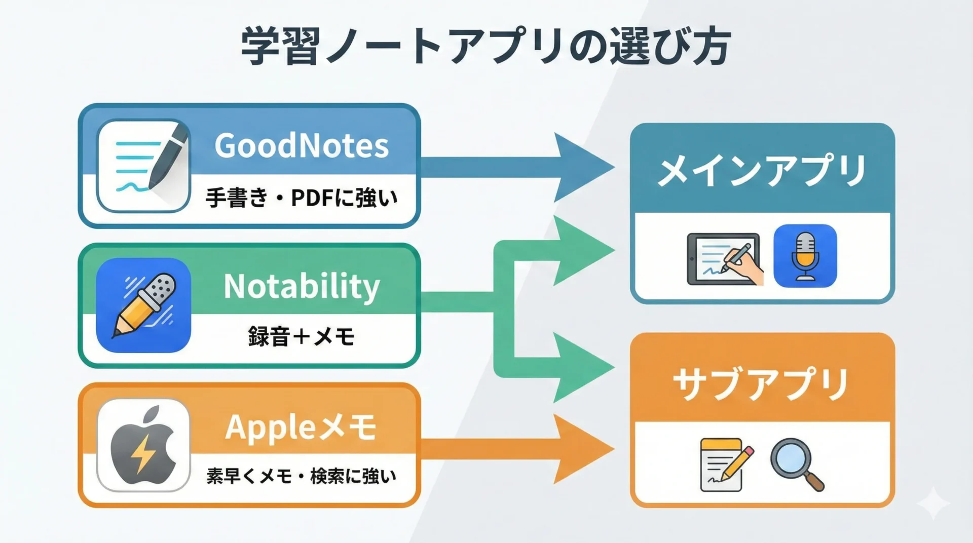 例えば、メインにGoodNotesで体系的な「まとめノート」を作り、サブとしてAppleメモで日々の「実験ログ」を残すスタイルです。