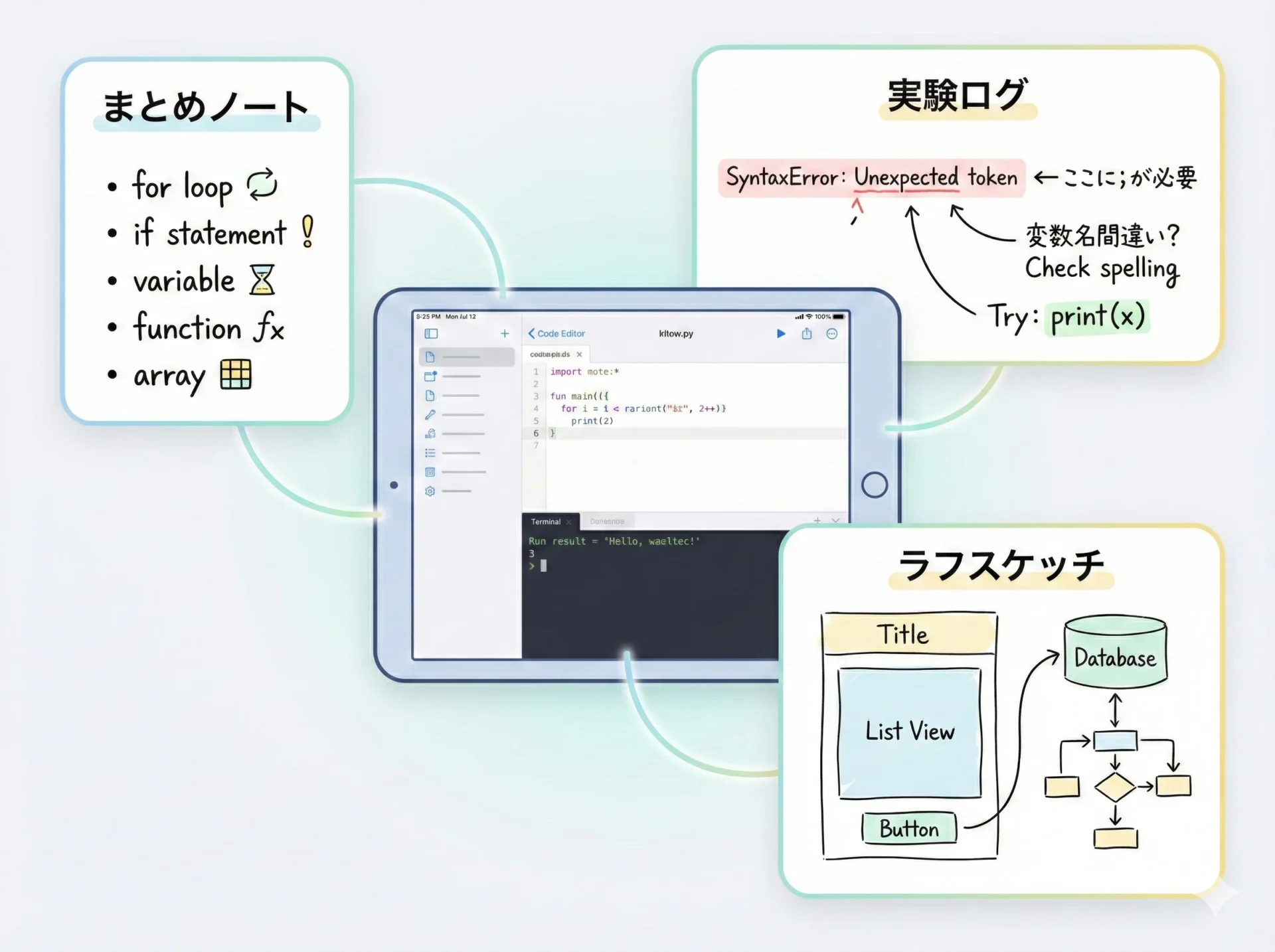 これらのアプリでコードを試しながら、うまく動いたコードや失敗したコードを、すぐノートに貼り付ける運用が理想です。
