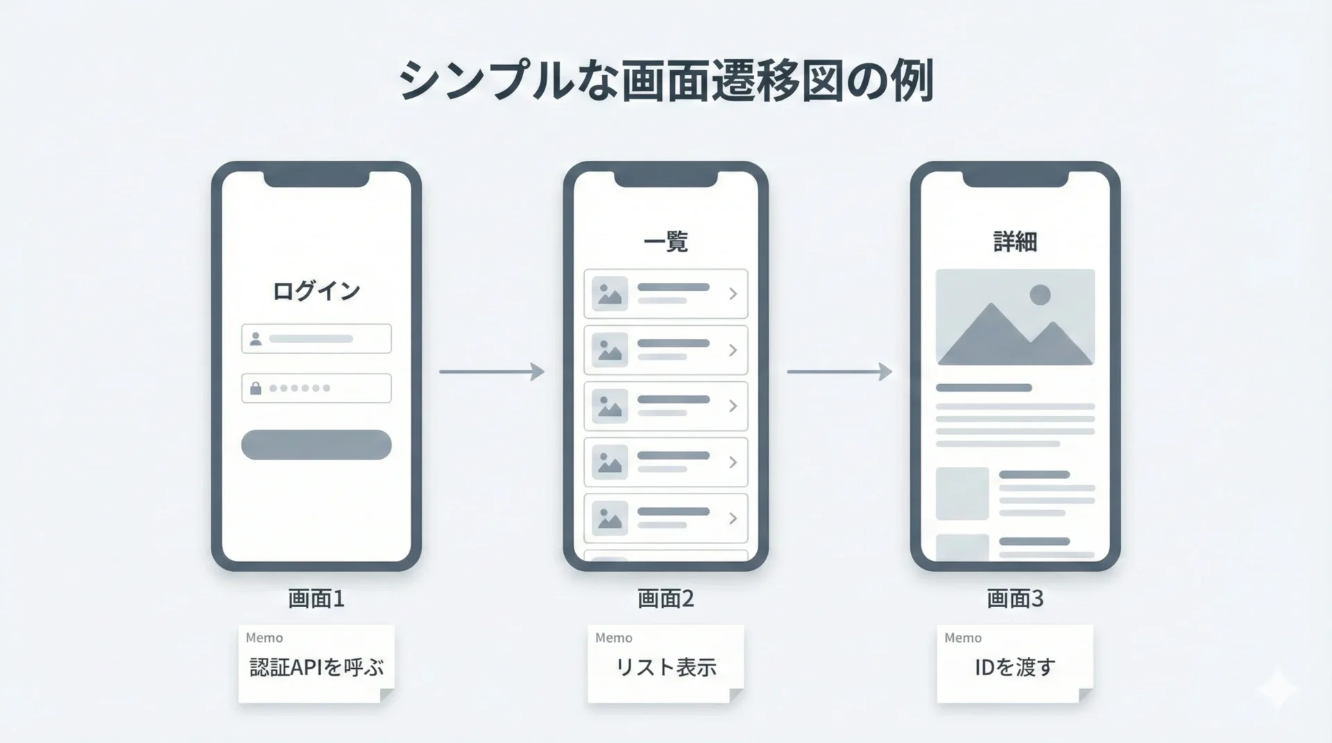 このような図をノートに描き、その横に「ここではJSON形式のデータが飛んでいる」「この段階で認証が行われる」とメモを添えます。