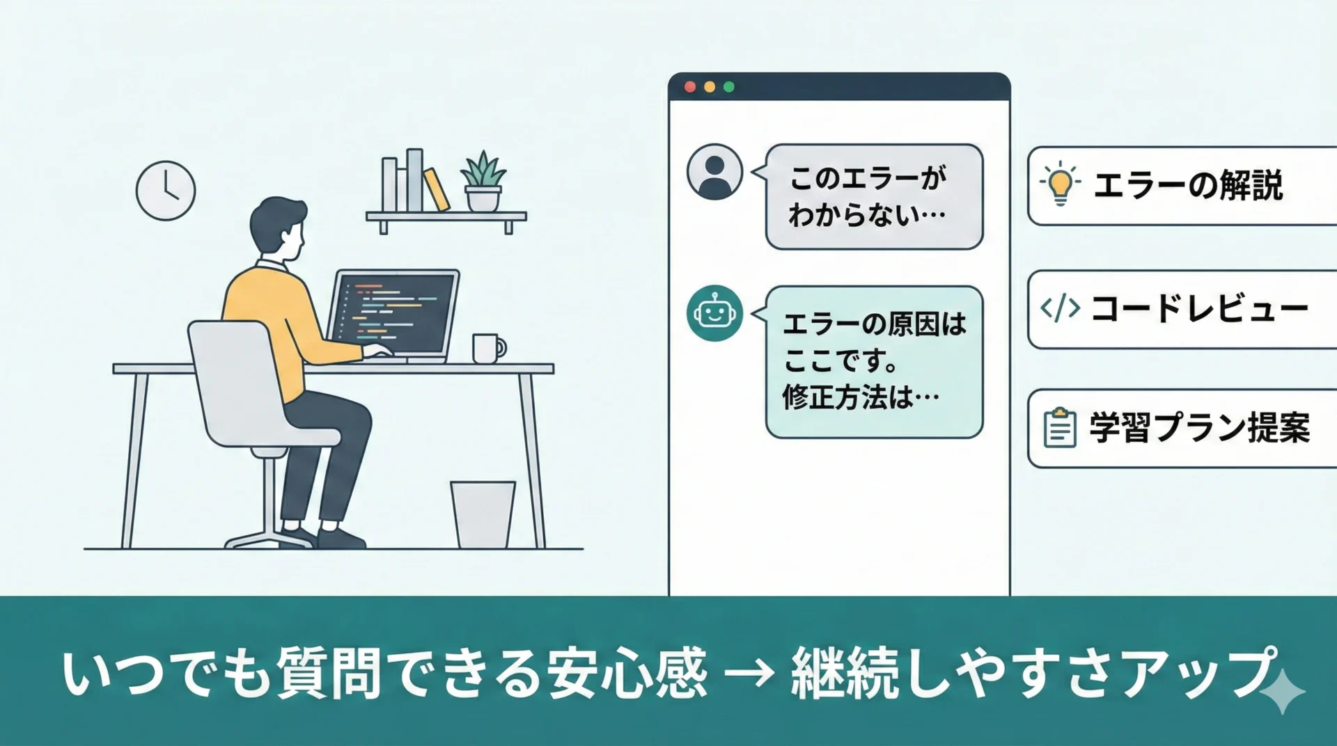 「わからないところをすぐに質問できる環境」は、学習の停滞を防ぎ、継続性を高めます。