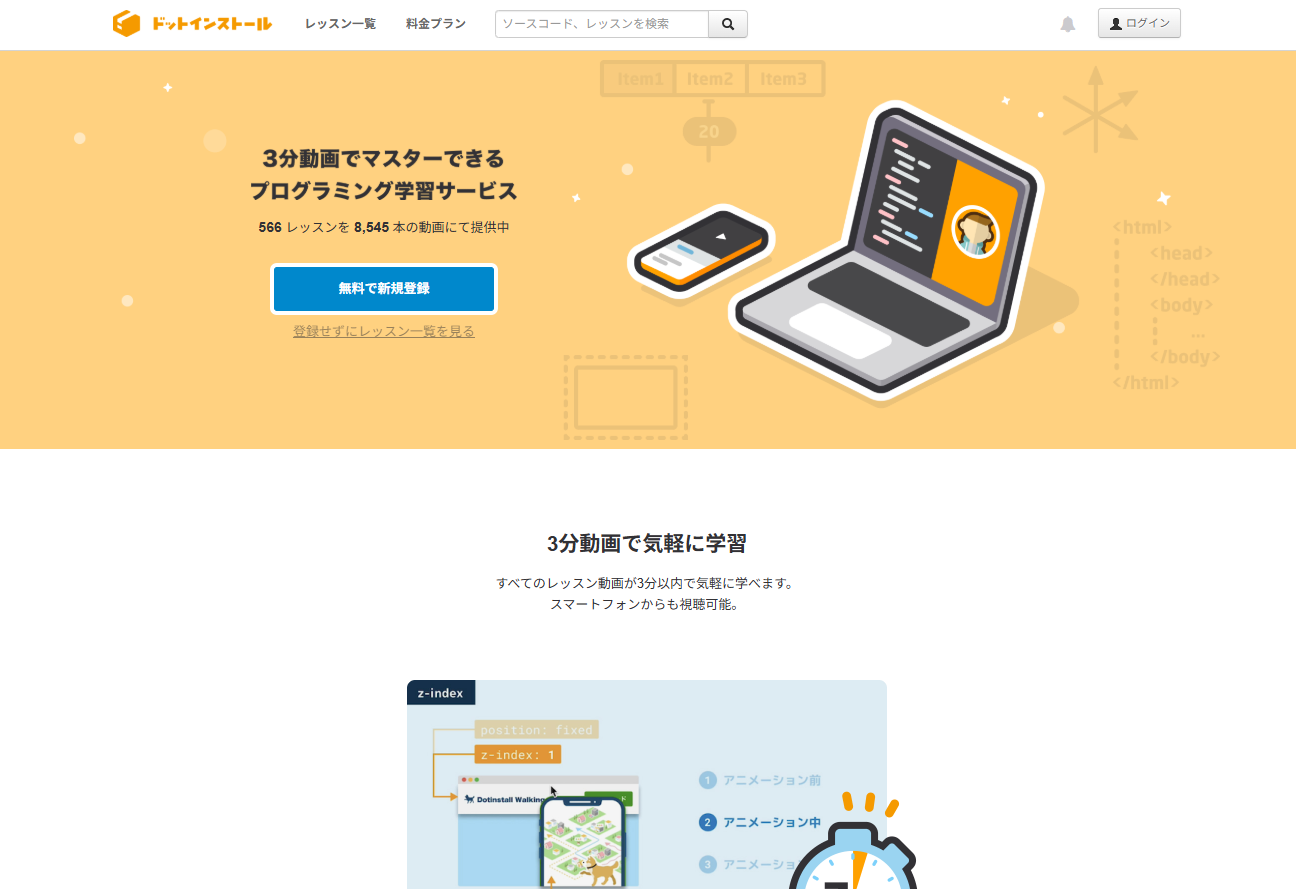 ドットインストールは、1本約3分の動画でプログラミングを学べる日本発の学習サービスです。