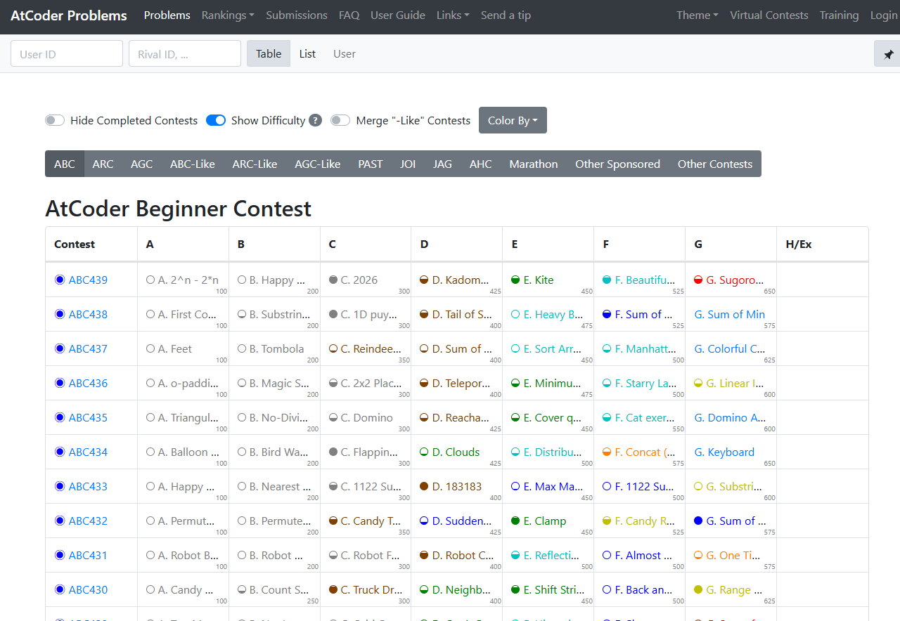 AtCoder Problemsには、「未解決問題の一覧」や「難易度別の問題リスト」などがあり、毎日解く問題を簡単に選べます。