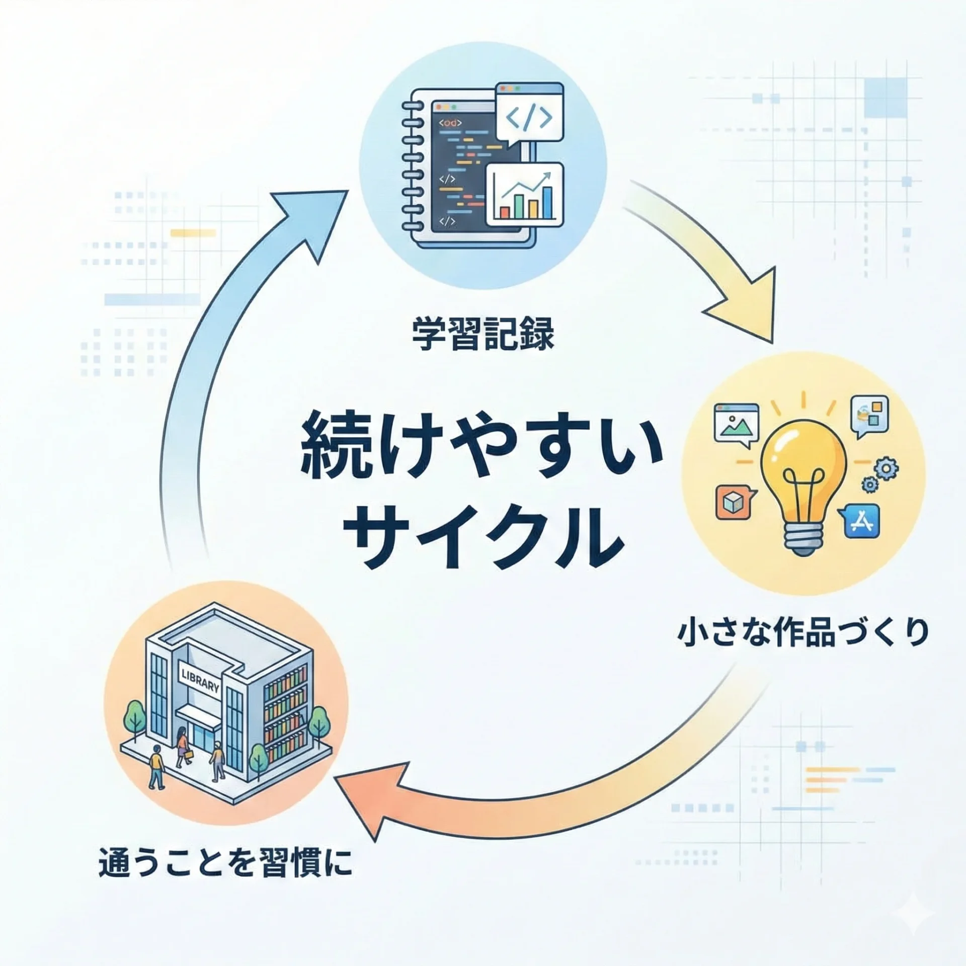 大切なのは、目的を明確にし、週単位の来館リズムと本のローテーションを決め、本によるインプットとコードを書くアウトプットを意識的に繰り返すことです。