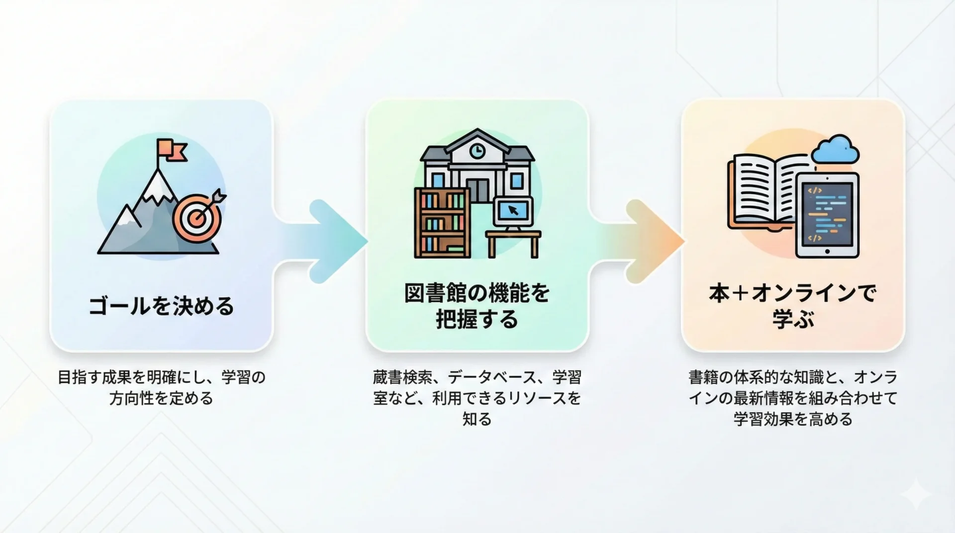 図書館を活用するうえで大切なのは、なんとなく本棚を眺めるのではなく、目的と優先順位を決めてから利用することです。