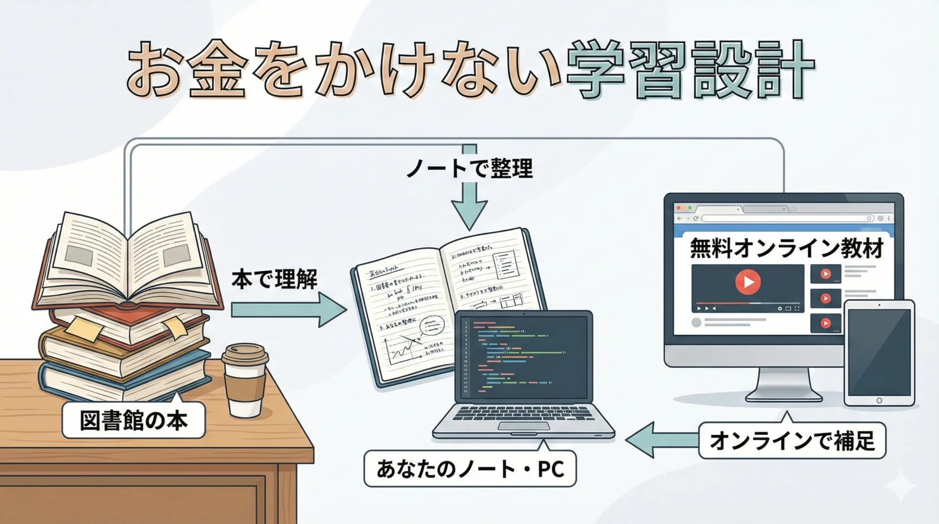 「お金をかけない」ことを徹底するなら、オンラインの無料教材と本の組み合わせは非常に強力です。