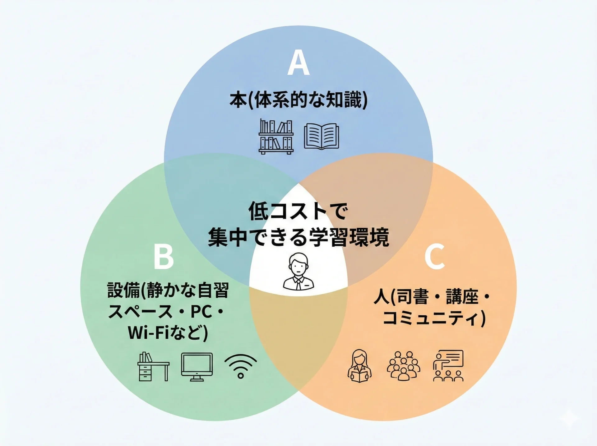 加えて、自習スペースやパソコン、Wi-Fi、司書によるレファレンスサービス、講座やイベントなど、図書館の設備とサービスを組み合わせれば、独学の弱点である「迷いやすさ」を補うことができます。