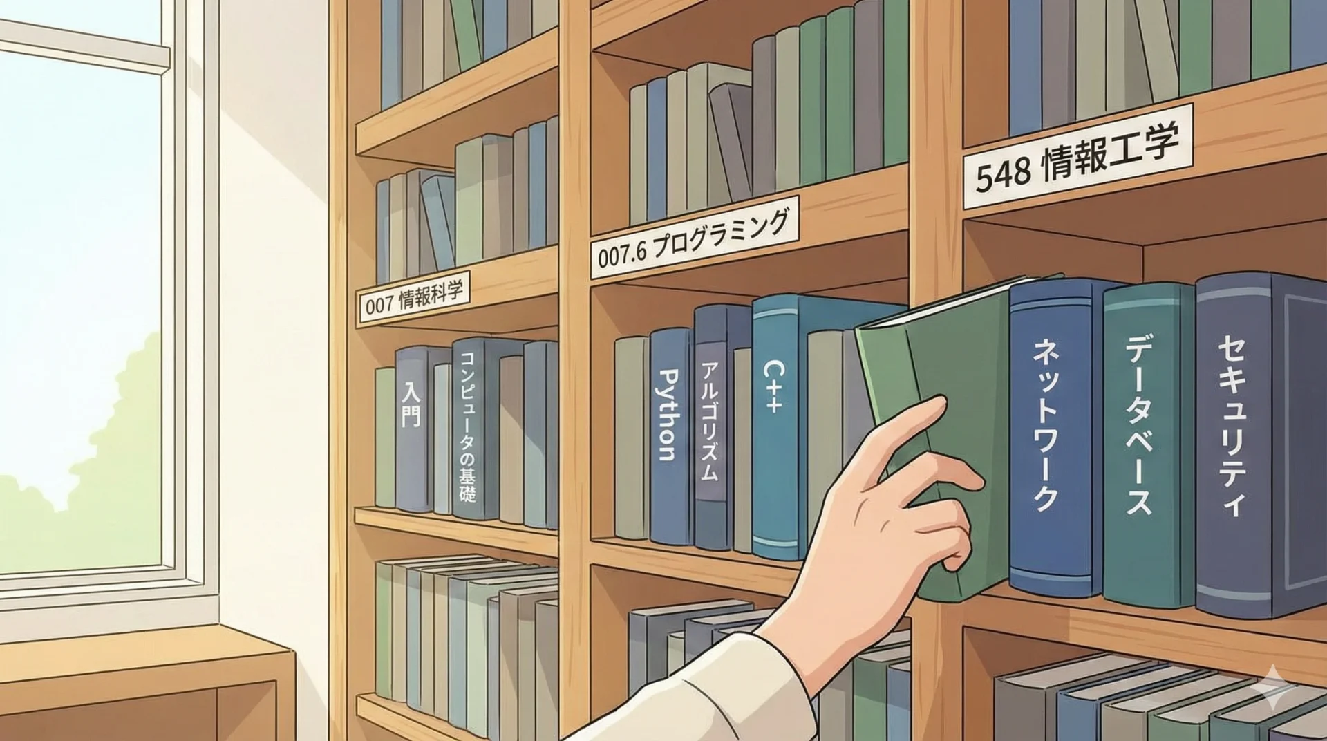 日本の多くの図書館では、NDC(日本十進分類法)という分類が使われており、プログラミングやコンピュータに関する本は主に「007」「548」などの番号の棚に集められています。