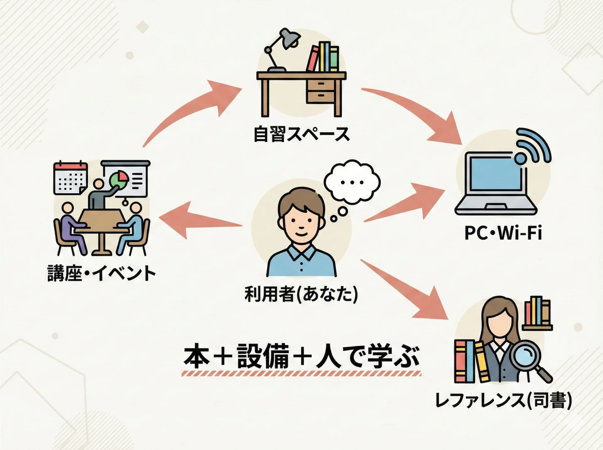 本や雑誌だけでなく、設備やサービスを組み合わせることで、図書館はとても強力な学習環境になります。