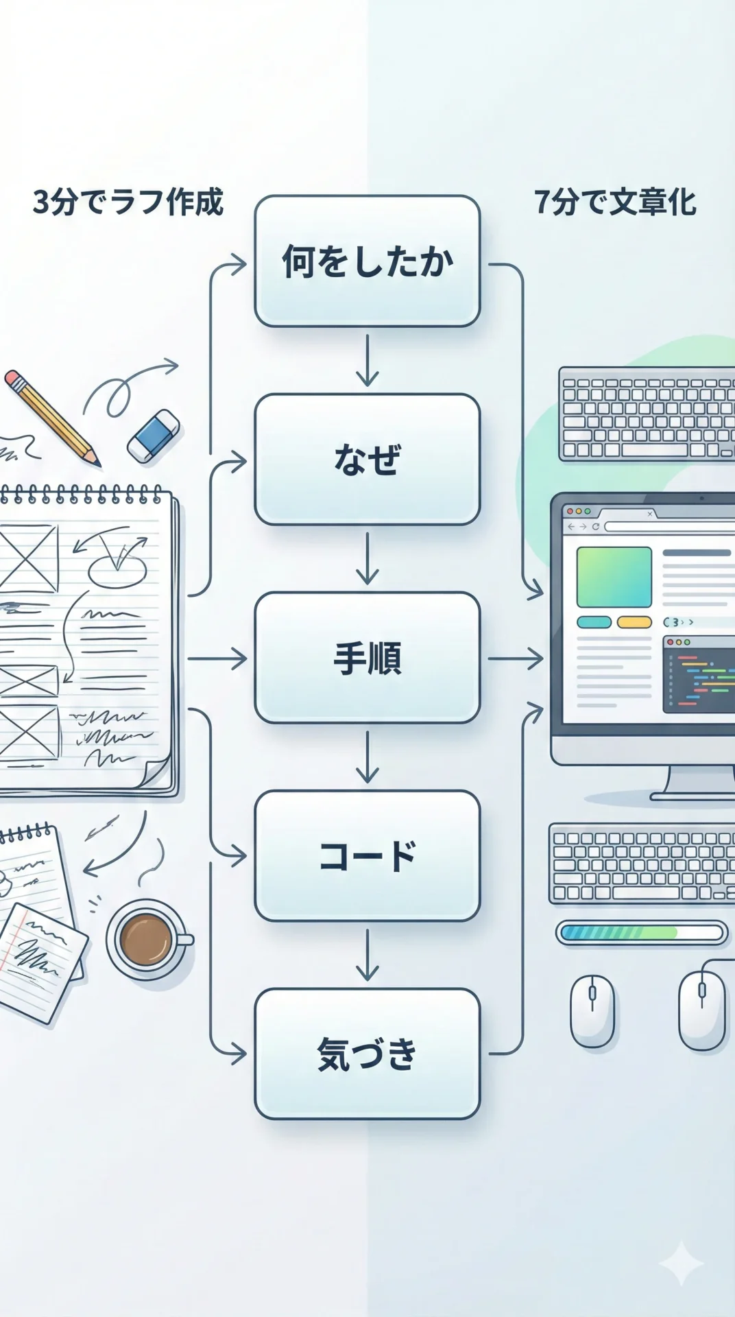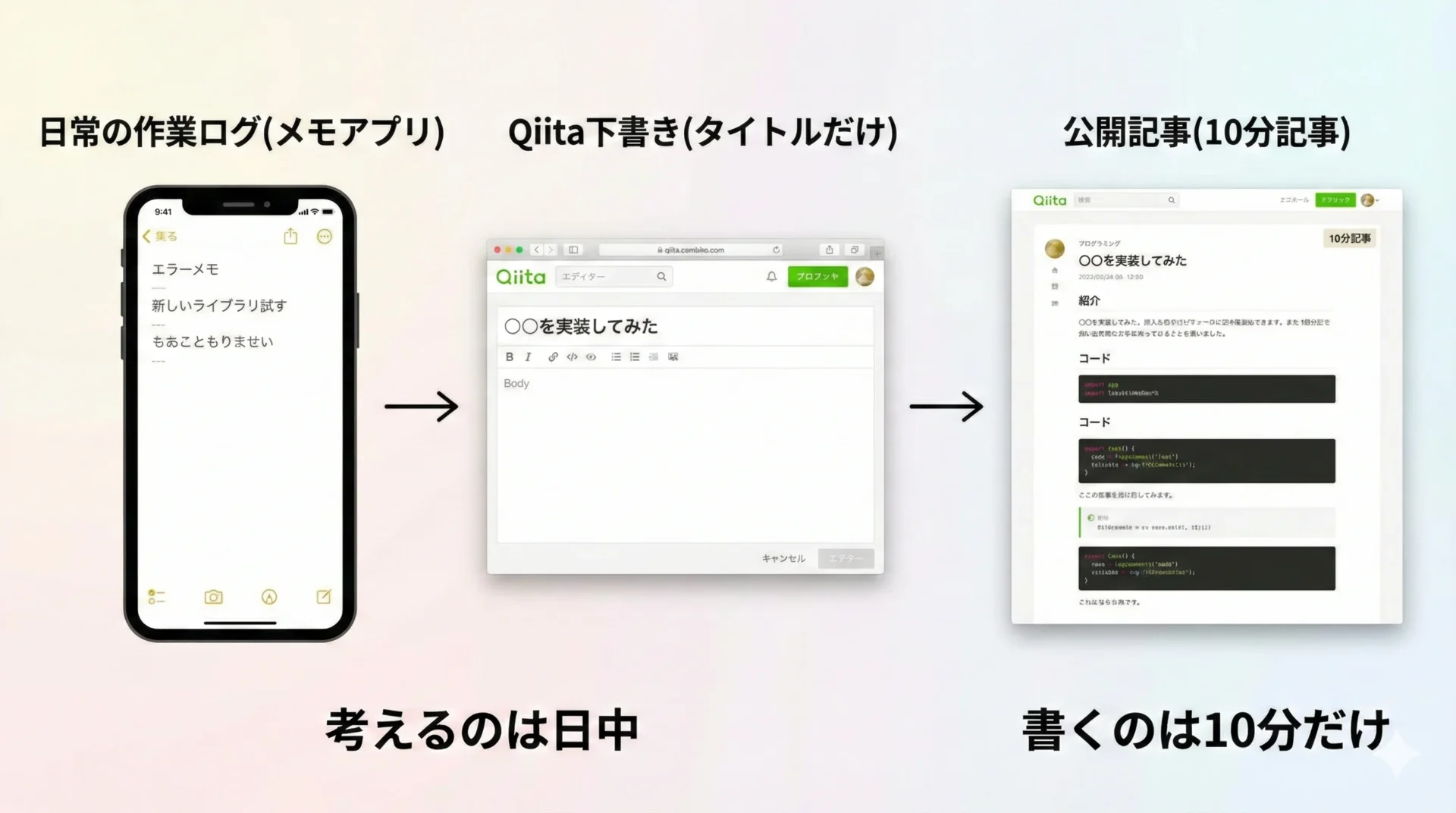 ネタメモやQiitaの下書き機能を活用し、「毎日投稿」ではなく「毎日10分」にコミットすることで、継続のハードルは大きく下がります。