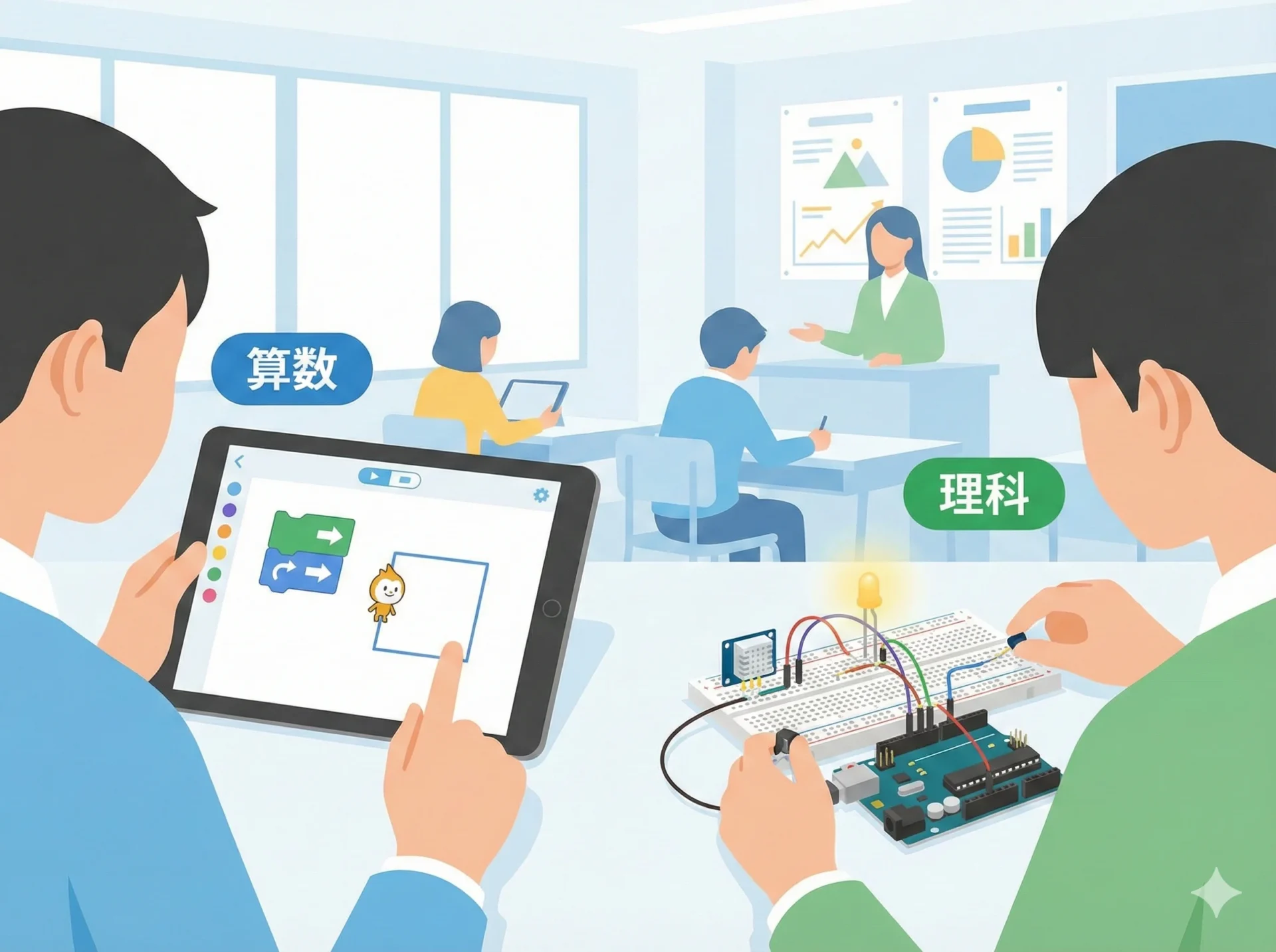 時間割に「プログラミング」という名前が載っていなくても、実際には算数や理科の中で取り組んでいる場合が多い点は押さえておきたいところです。