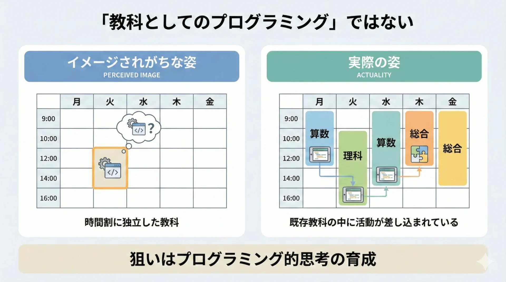 多くの方がイメージする「新しい教科としてプログラミングの授業が週に何コマもある」という状況とは、実際にはかなり異なります。