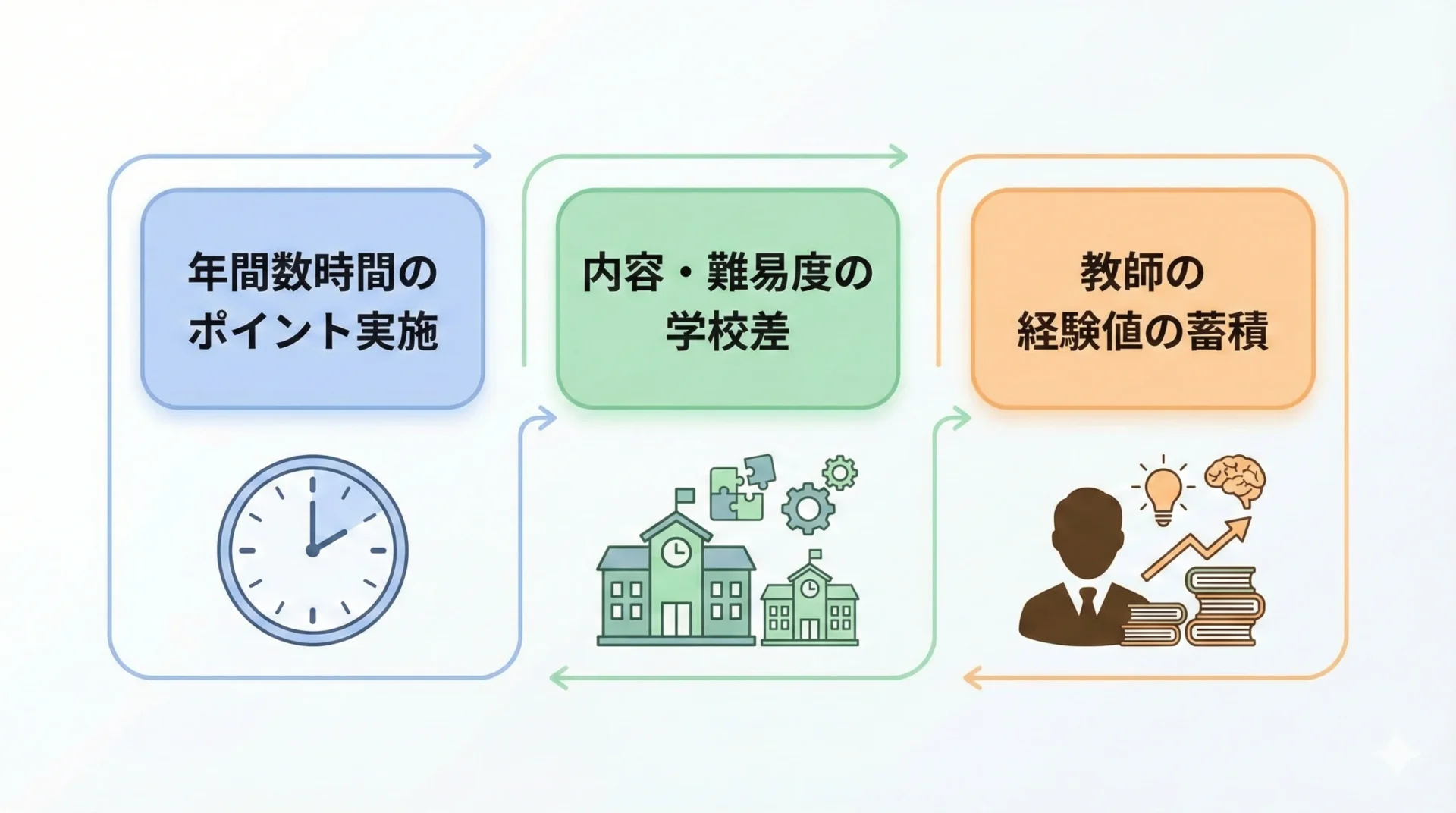 現場では、年間数時間〜十数時間程度の「ポイント実施」が主流で、内容や難易度には学校ごとの差があります。