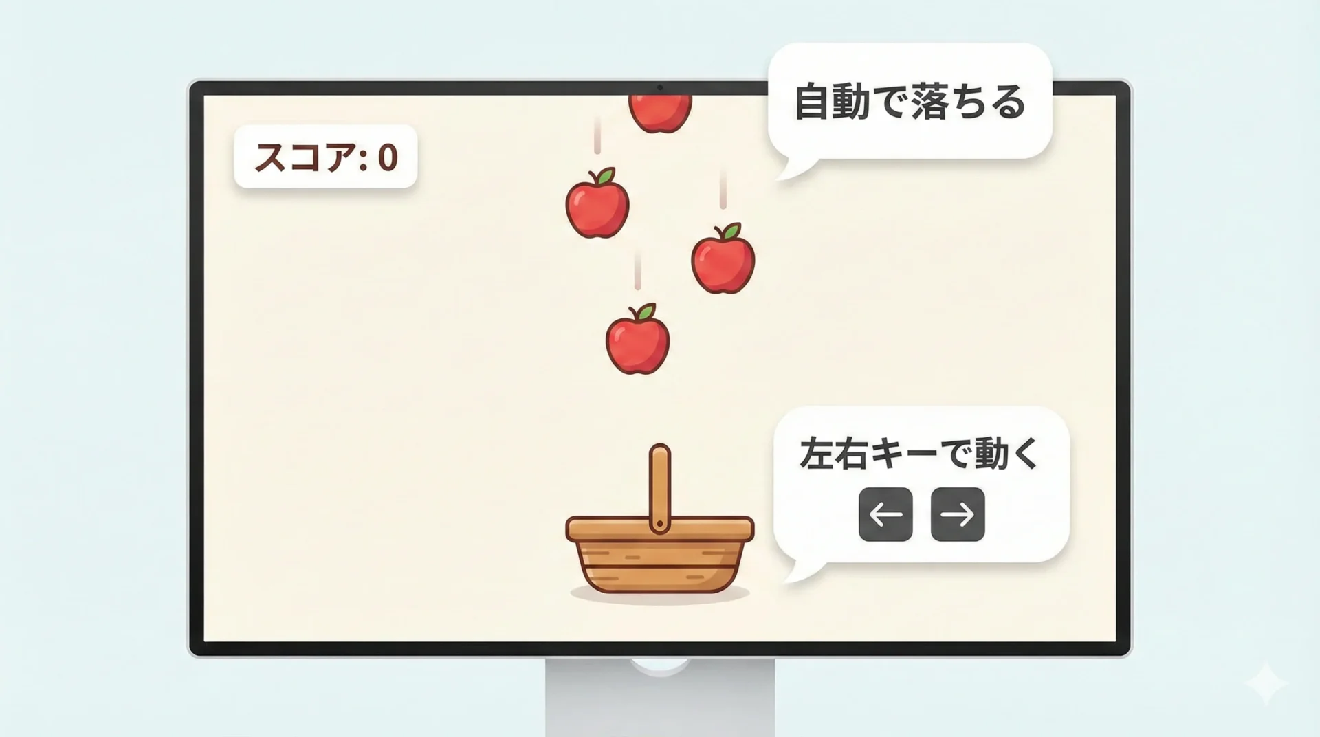 ここでは、「落ちてくるリンゴをバスケットでキャッチするゲーム」を例に、制作の流れを説明します。