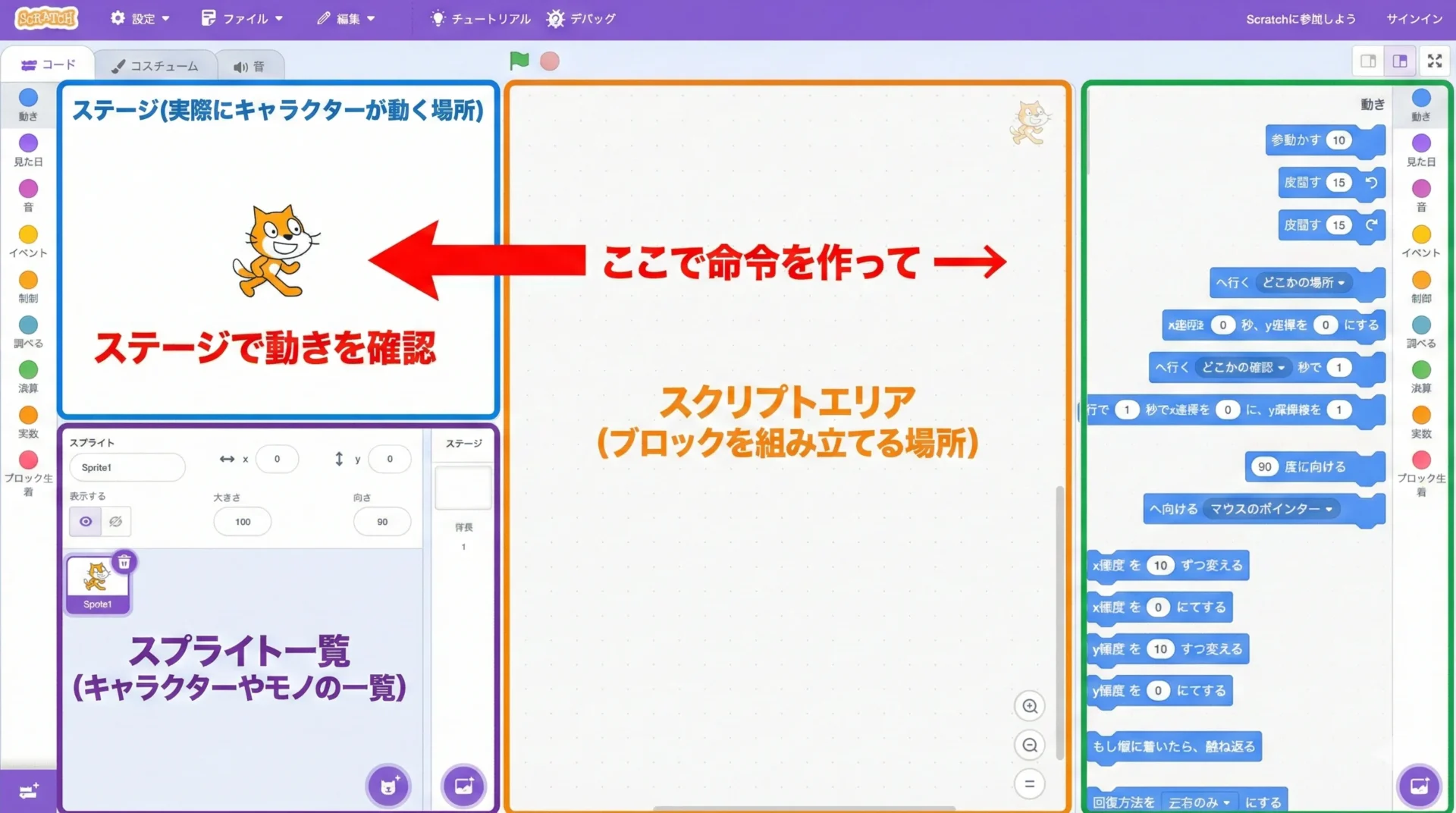 Scratchの画面には、いくつかの重要なエリアがあります。