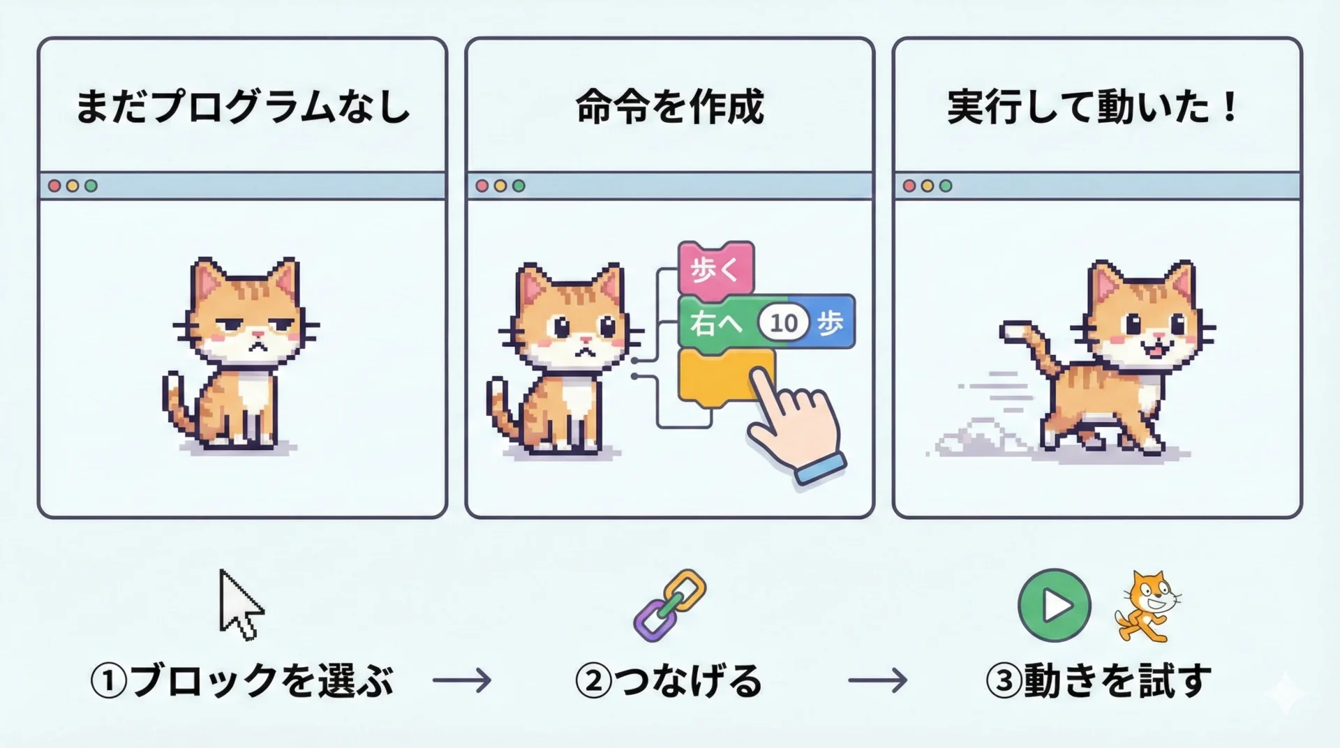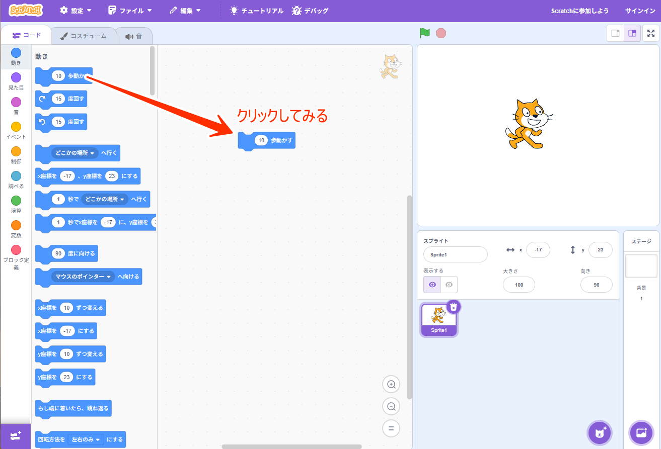 このように、ブロックをクリックするだけで命令を試せるので、試行錯誤しながら動きを理解しやすいのがScratchの良いところです。