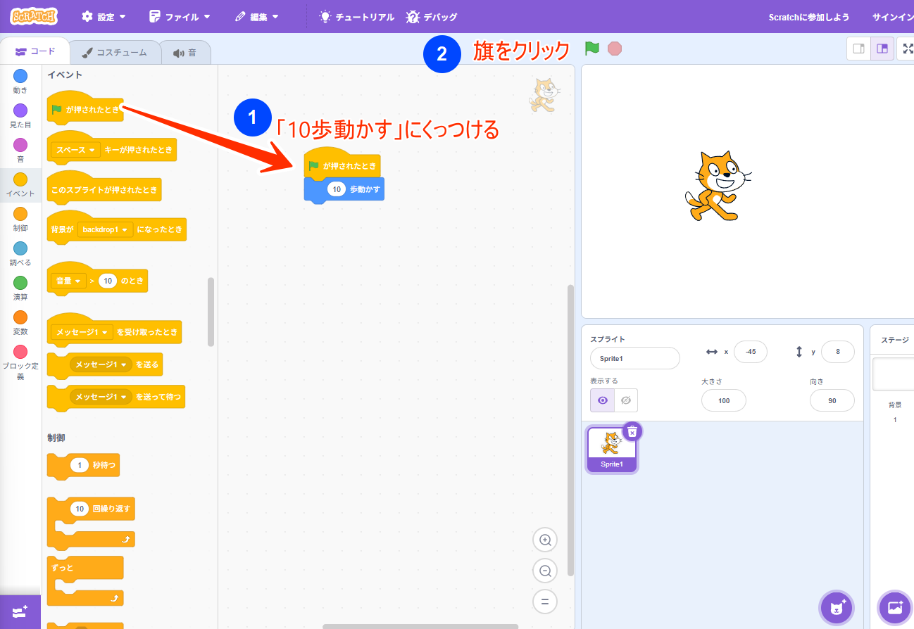 10歩動かすブロックをスクリプトエリアにドラッグ- ブロックをクリックして実行してみる
