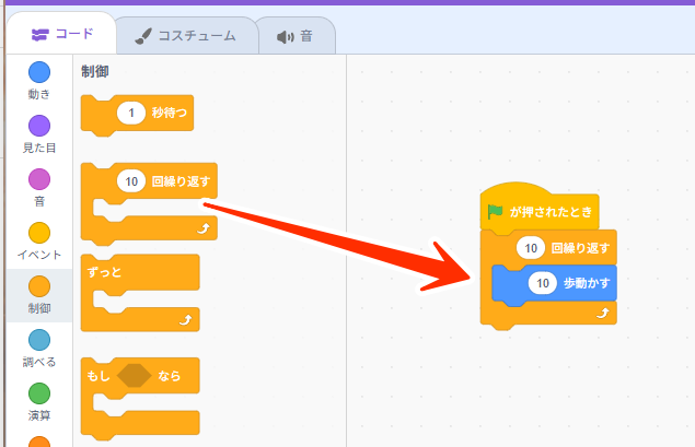 制御カテゴリから10回繰り返すブロックを持ってくる10歩動かすブロックを10回繰り返すの中に入れる- これを