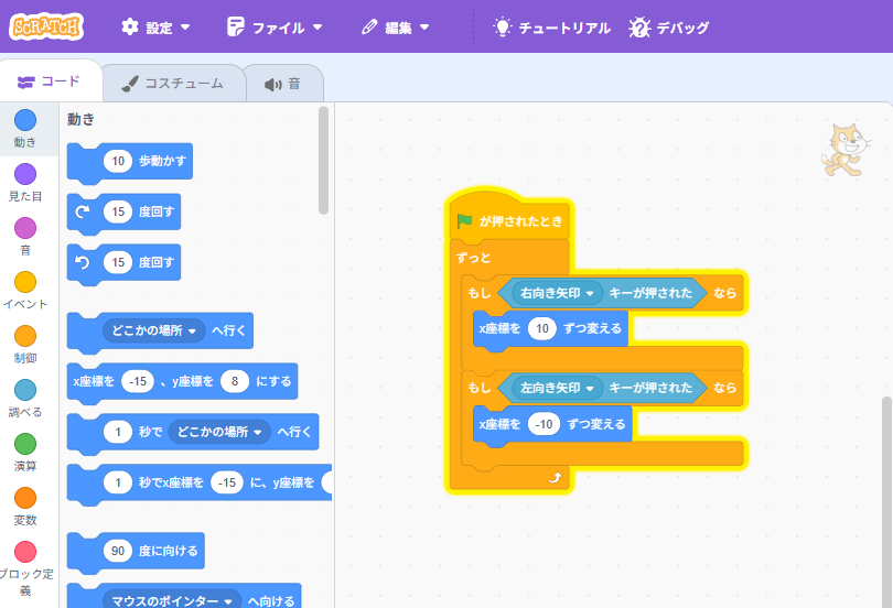調べるカテゴリにあるキー(右向き矢印)が押された、キー(左向き矢印)が押されたの条件を設定 動きカテゴリにある条件の中にx座標を10ずつ変える、x座標を-10ずつ変えるを入れる