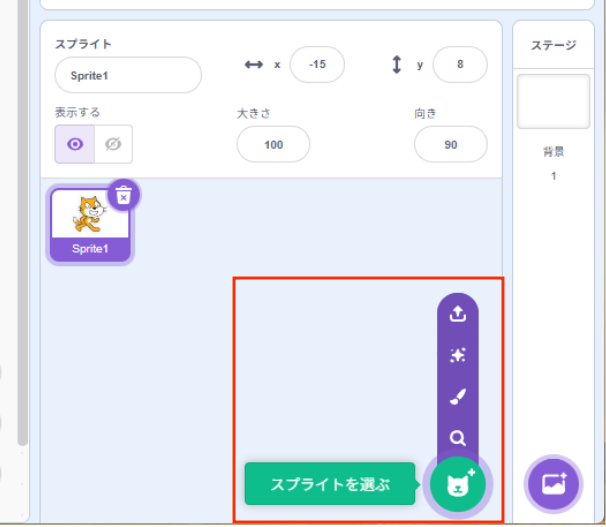 ステージに登場するすべてのキャラクターや物体がここに表示され、どのスプライトを選んで命令を書くかを切り替えることができます。
