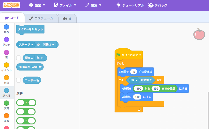 スクリプトはスプライトごとに設定するので、右下のスプライト一覧からりんごを選ぶのを忘れないでください。