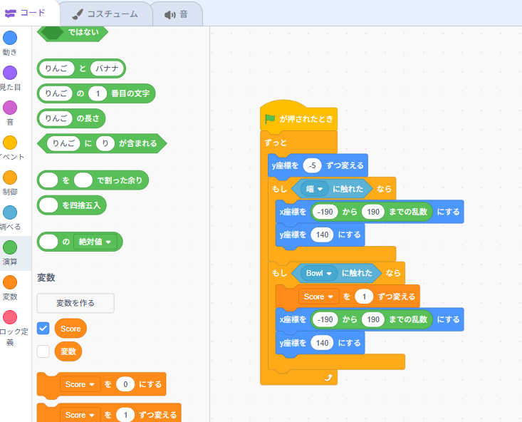 旗が押されたときブロックを置くずっとブロックの中に、以下のような流れを作るy座標を-5ずつ変える(下に落ちる動き)- もしステージの一番下まで来たら、