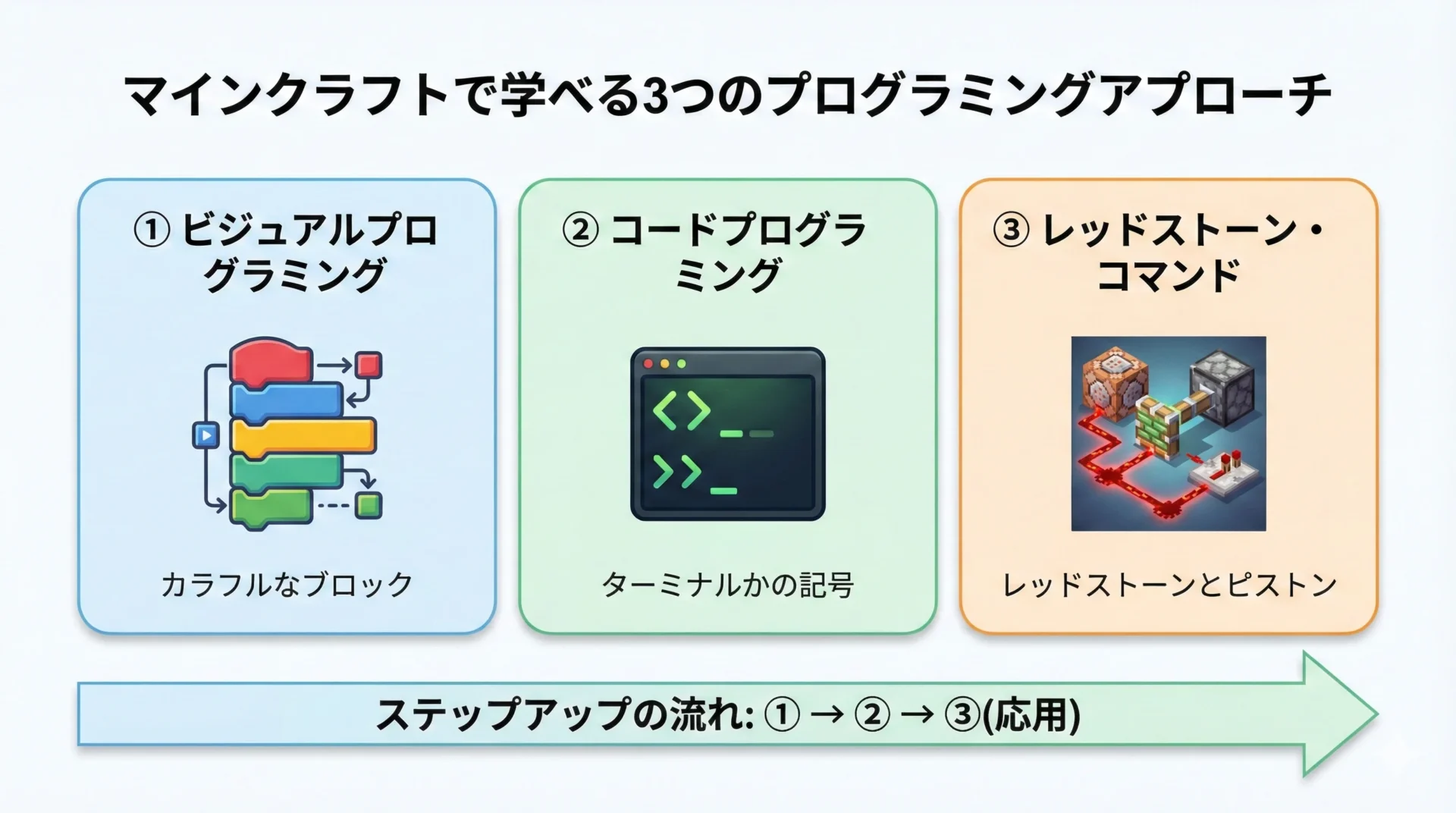 マインクラフトを使ったプログラミング勉強は、学ぶ人の年齢や目的によって適したスタイルが変わります。
