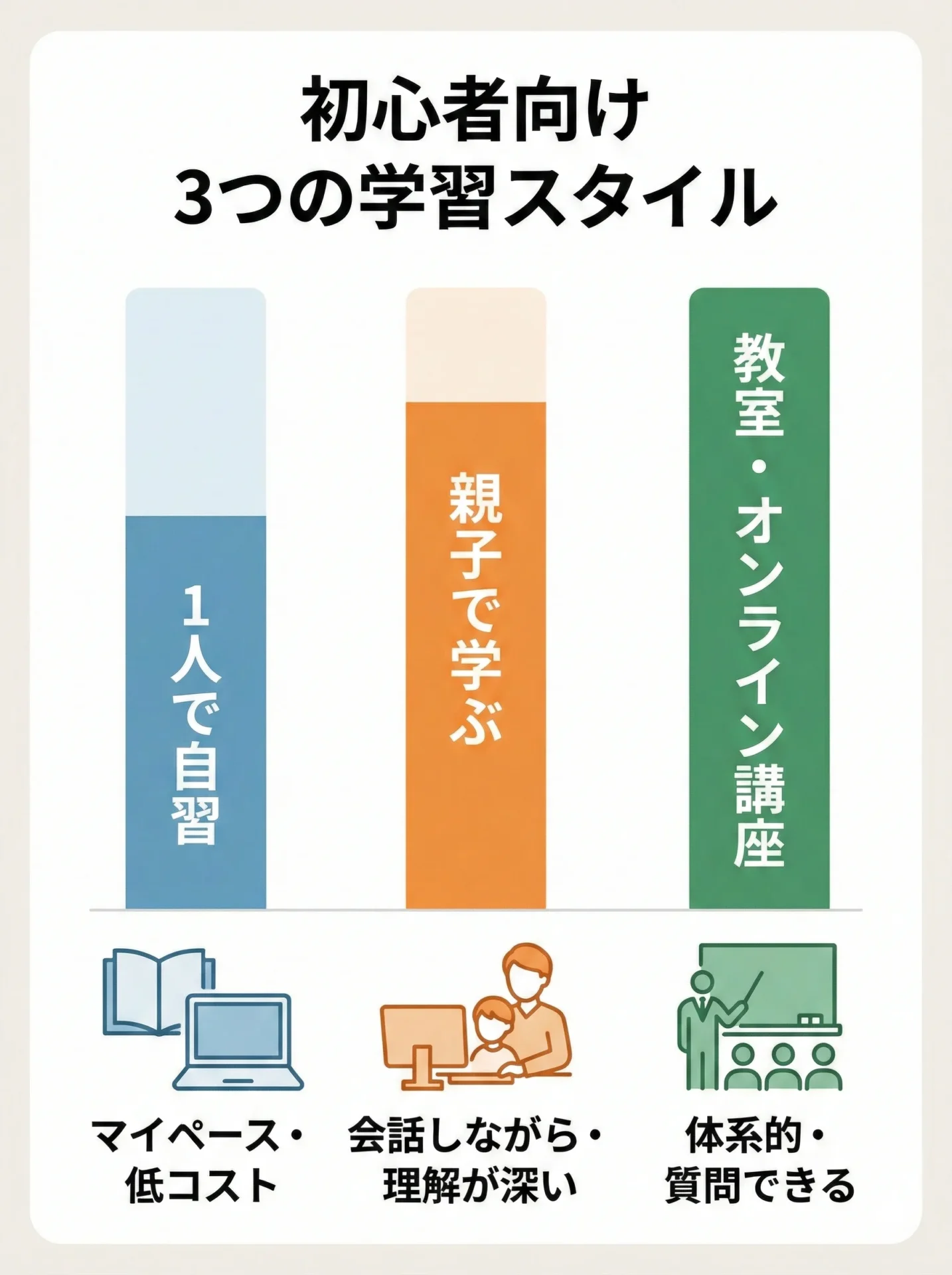 ここでは、特に初心者に向いている3つの学び方を紹介します。
