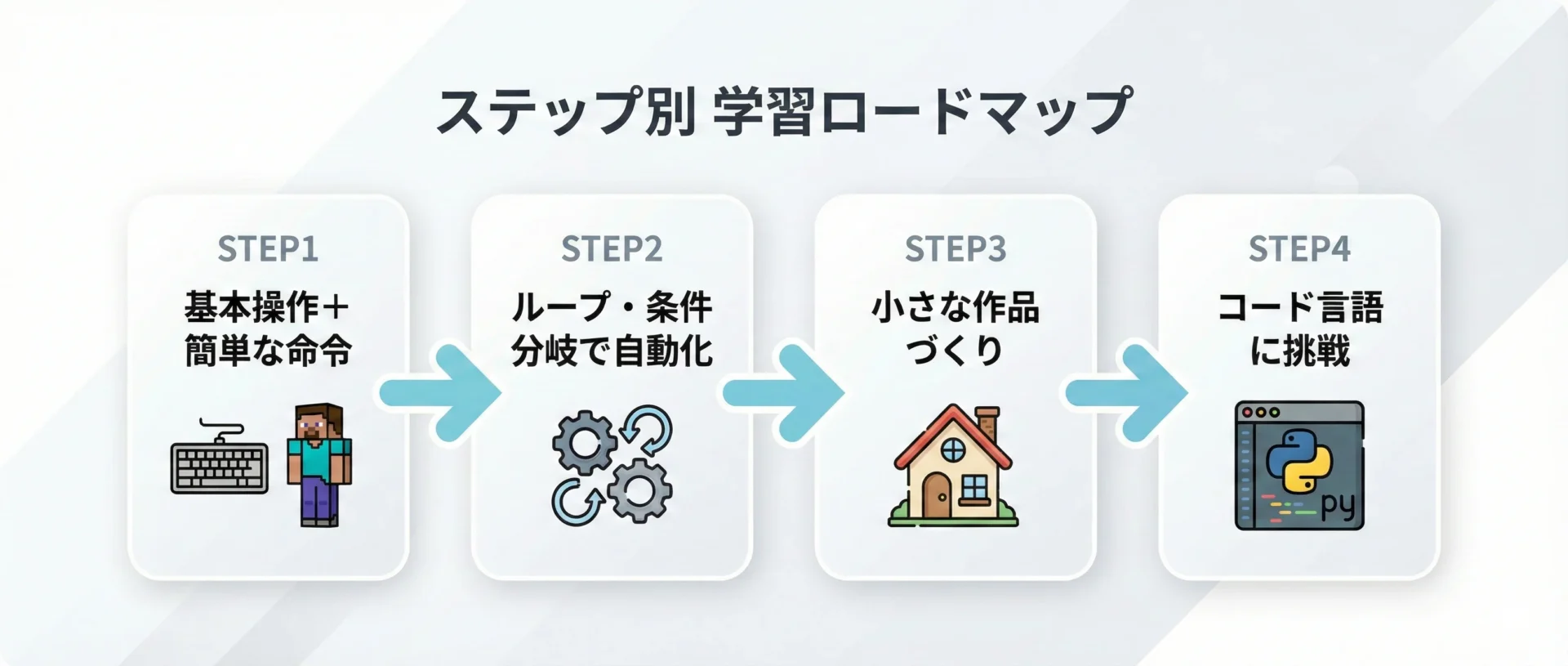 ここからは、マインクラフトでプログラミングを勉強する際の、初心者向けステップ例を紹介します。