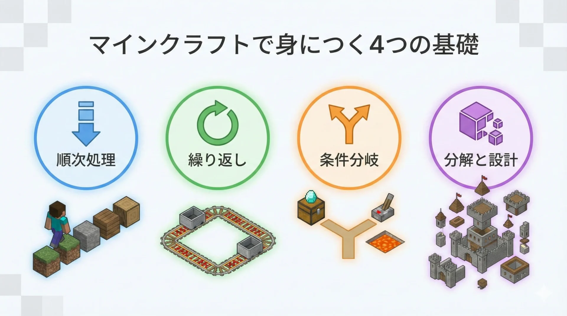 ここでは、マインクラフトで学びやすい代表的な4つのプログラミング基礎を紹介します。